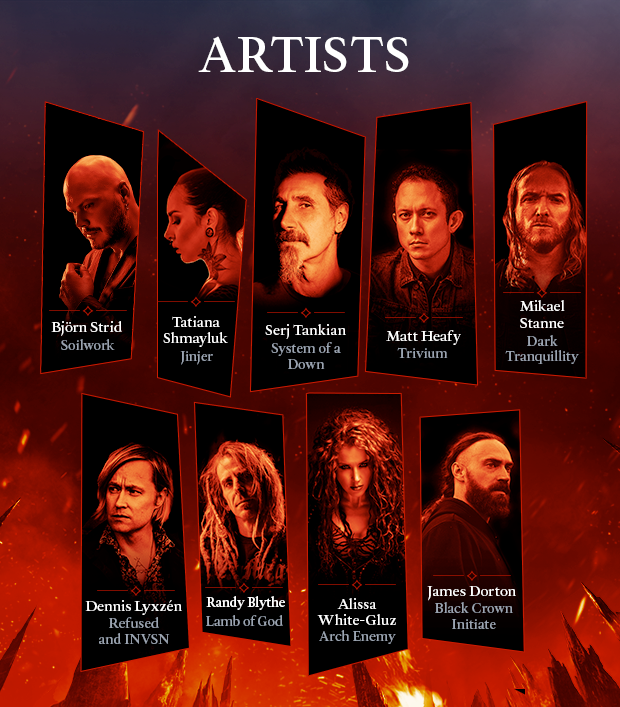모든 트랙은 Serj Tankian(System of a Down), Matt Heafy(Trivium), Mikael Stanne(Dark Tranquillity), Randy Blythe(Lamb of God), Alissa White-Gluz와 같은 금속 아이콘의 보컬로 게임을 위해 특별히 제작되었습니다. (Arch Enemy) 및 Tatiana Shmailyuk (Jinjer).