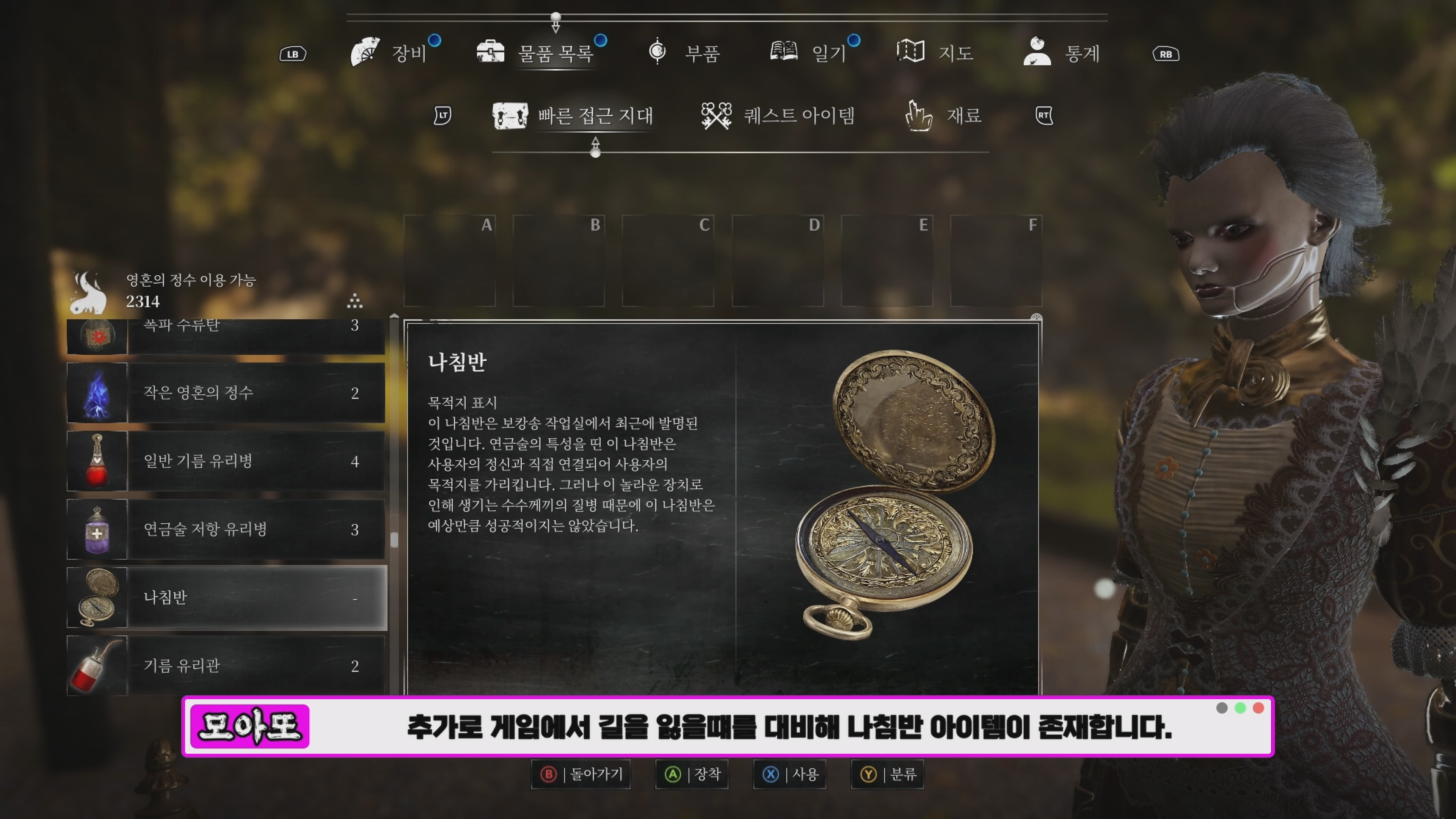 일종의 네비게이션 같은건데 나침반이 있습니다. 그냥 게임상에서 표시를 해주는경우가 많은데 이게임에선 나침반을 습득해서 착용하고 사용하면 어디로 가야하는지 표시를 해줍니다. 그런데 그쪽으로 무작정 갈순없다는게 함정.