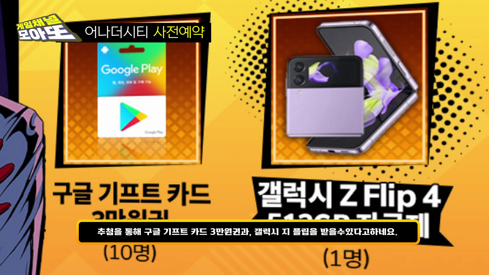 전략적 요소와 상성등을 활용한 방치형 모바일 RPG게임으로, 미국풍 일러스트의 빈티지 감성에 다이나믹한 전투씬을 경험할수있는 게임입니다. 이번 사전예약을 통해 구글기프트카드와 갤럭시z플립등을 추첨을 통해 지급한다고하니 도전해보세요!