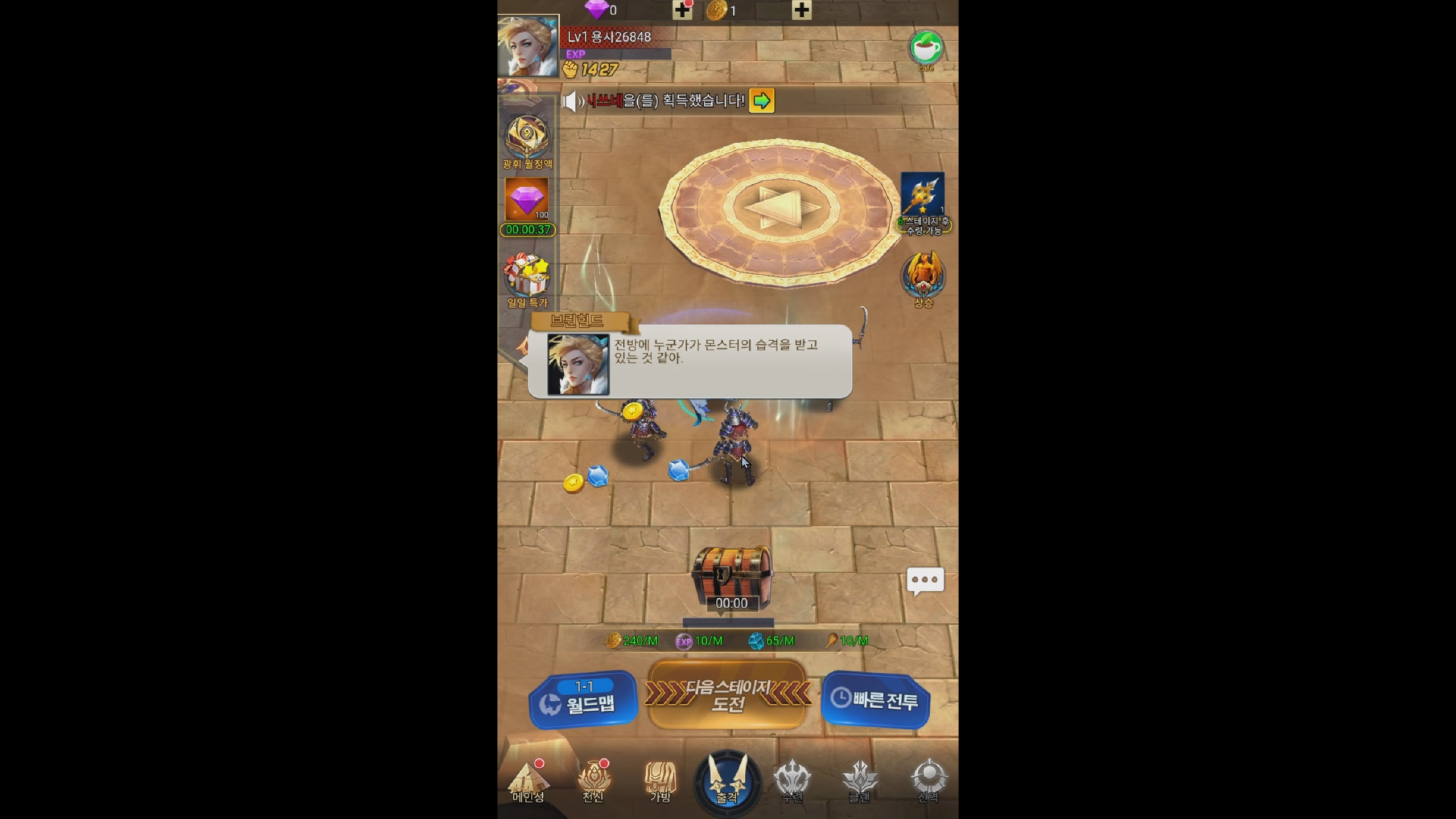 게임을 시작하자마자 처음부터 바로 소환을 한번진행하고 바로 전투에 돌입합니다. 그 이후로 끝없는 전투가 시작되고 천신이라는 영웅을 소환 및 조합 합성을 통해 얻고 장착하여 레벨업과 장비를 강화하며 높은 단계를 향해 올라가게됩니다.