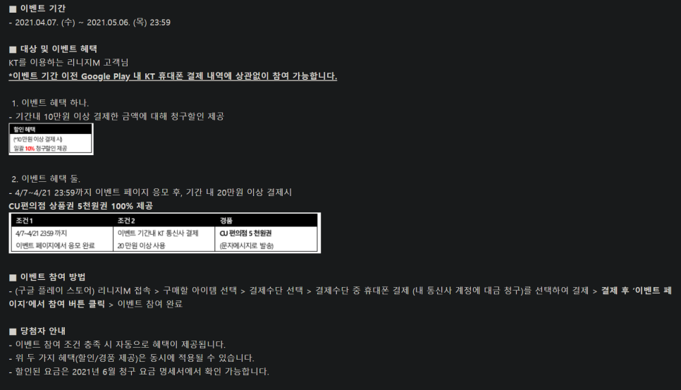 KT 4-5월 제휴 할인 이벤트 (구글플레이스토어)