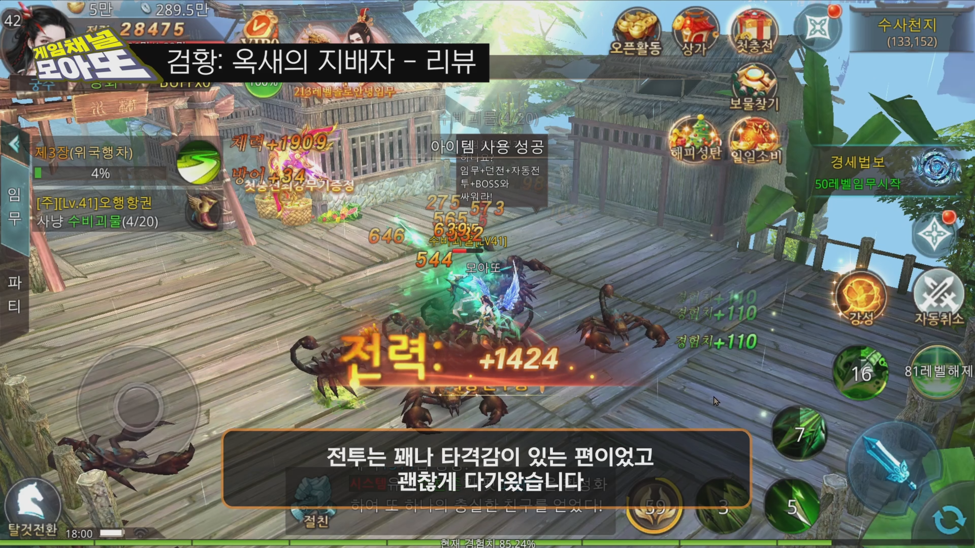 이런 양산형 게임의 핵심은 역시나 전투라고 생각되는데요. 전투가 나쁘지 않습니다. 모션이 거슬리거나 타격감이 아에 없거나 하는것도 아니고 적절하게 잘 구현해둬서 보는맛이 있습니다. .다만 뭐 기합같이 다이나믹한 효과는 없어서 그게 뭐랄까 사운드적인 부분이 조금 아쉬웠달까?