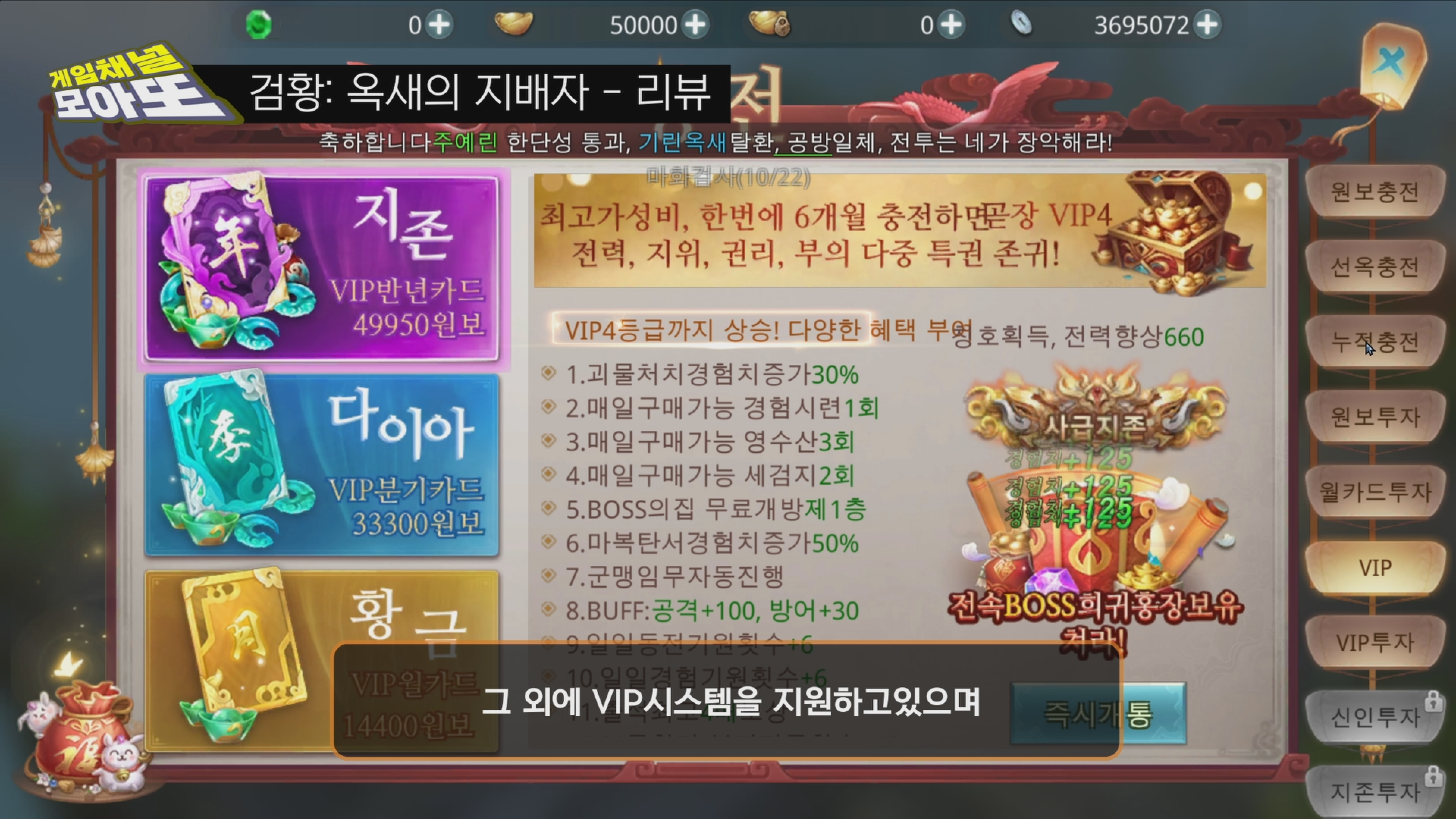 몇분 되지도 않았는데 아이템 장착하는 줄알고 눌러보면 충전하라는 메세지가 뜨더군요. 과금유도는 초반부터 진행되는 편이고 VIP 시스템을 가지고 있기에 유혹이 될수있습니다. 이런게임이 초반에 몰입이 잘되고 레벨업이 시원시원 하다보니 조금만 막혀도 엄청 답답하게 느껴지면서 과금으로 시원하게 뚫고 가고싶게 만드는 욕구를 불러일으키는데 잘 참고 무과금으로 즐길만큼만 즐겨보시면 괜찮은 게임입니다.