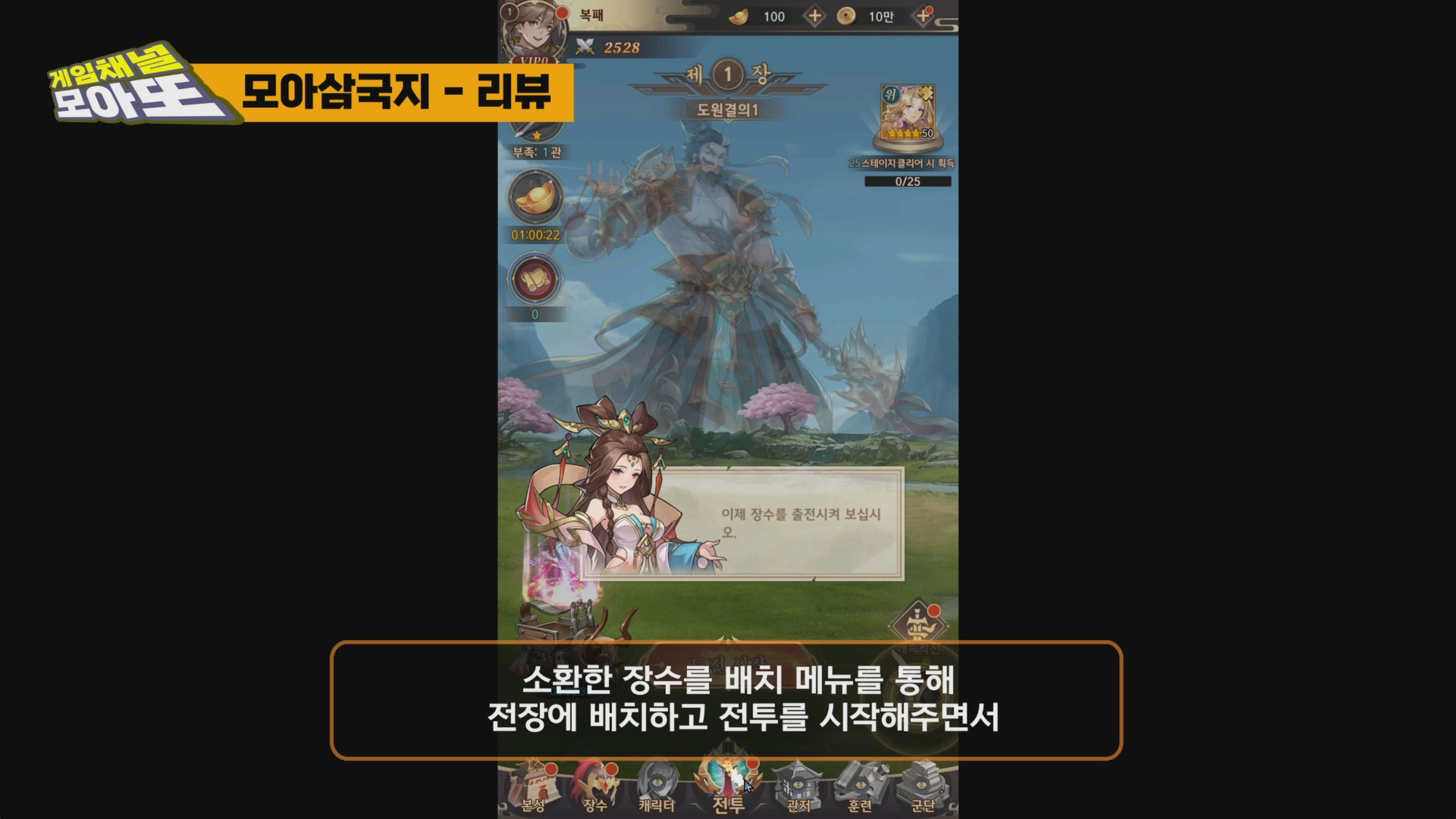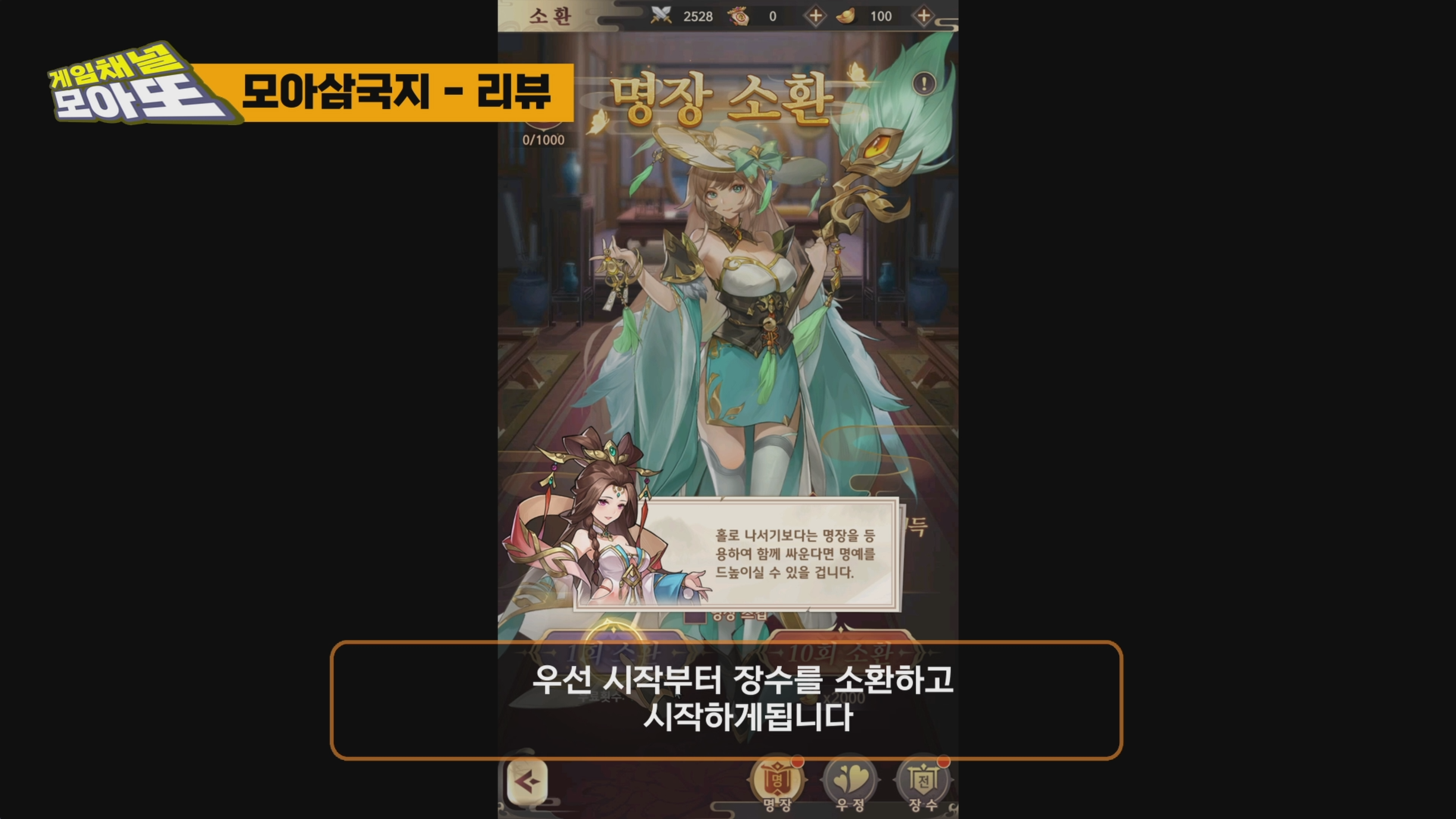 게임을 시작하면 바로 수집형 RPG 답게 장수를 소환하고 시작하게됩니다. 장수 소환에는 뽑기와 조각을 합성해서 얻는 방버등이 있으며 천장시스템이 존재하기때문에 10회 소환시 5성 장수를 반드시 얻게되는 시스템이 존재합니다. 고로 크게 스트레스 받아가면 장수를 뽑을 필요는 없다라는것은 접근성을 높이는 부분이라고 생각합니다.