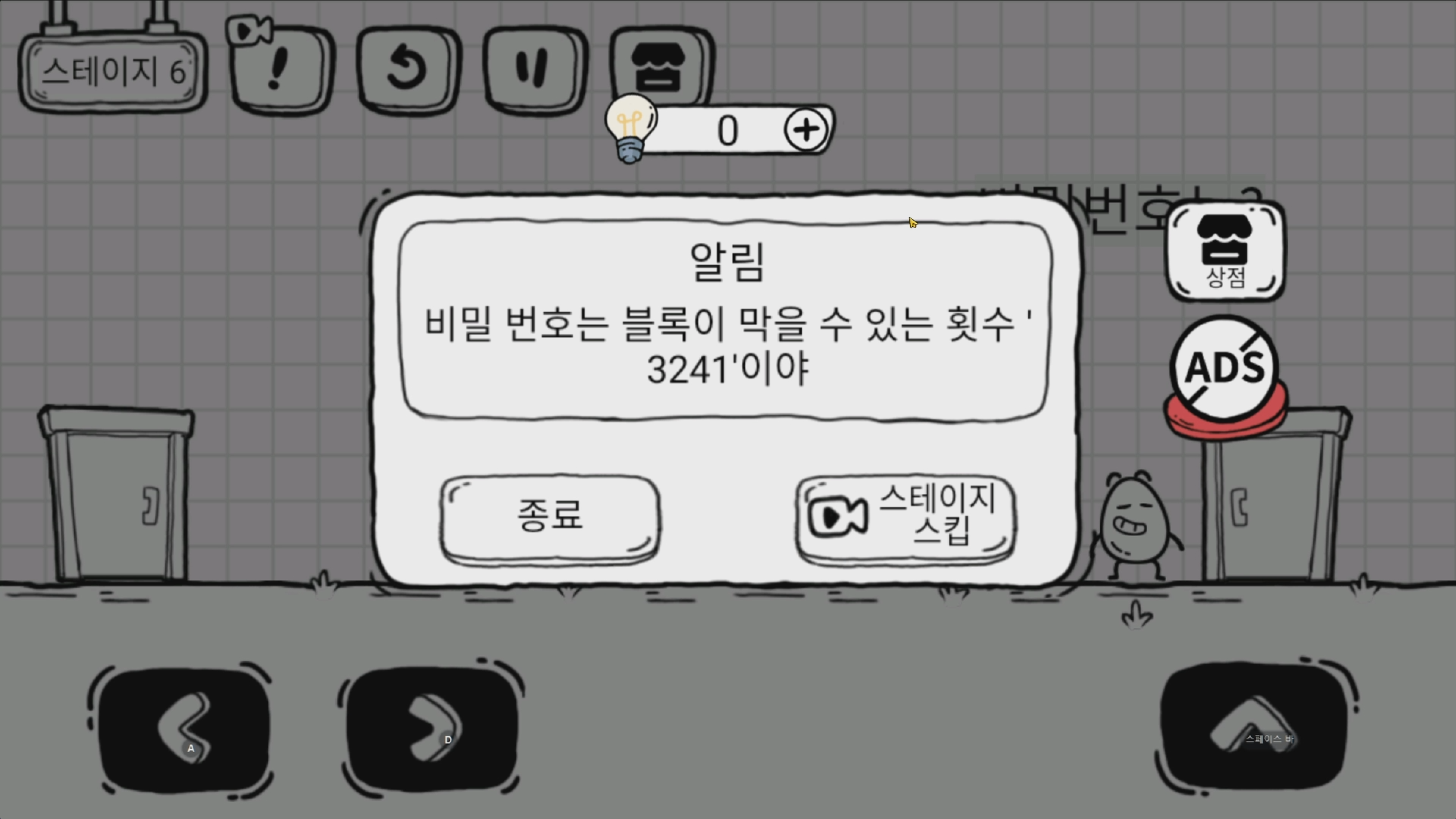 게임이 어려우신가요? 막혀서 답답하신가요? 그럼 힌트를 활용할수있습니다. 힌트를 사용하는건 제한이 없지만 광고를 시청해야합니다. 긴 광고를 보게될수있고 짧은 광고를 보게될수도있지만 시청후에는 이번 스테이지에대한 답을 주게됩니다.