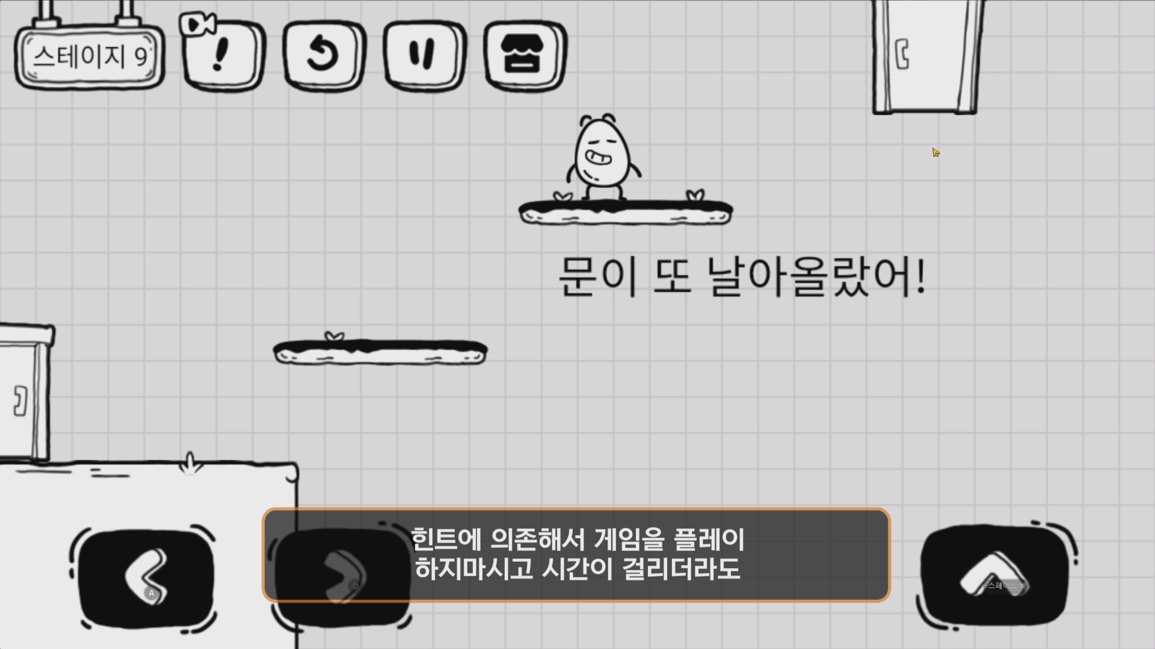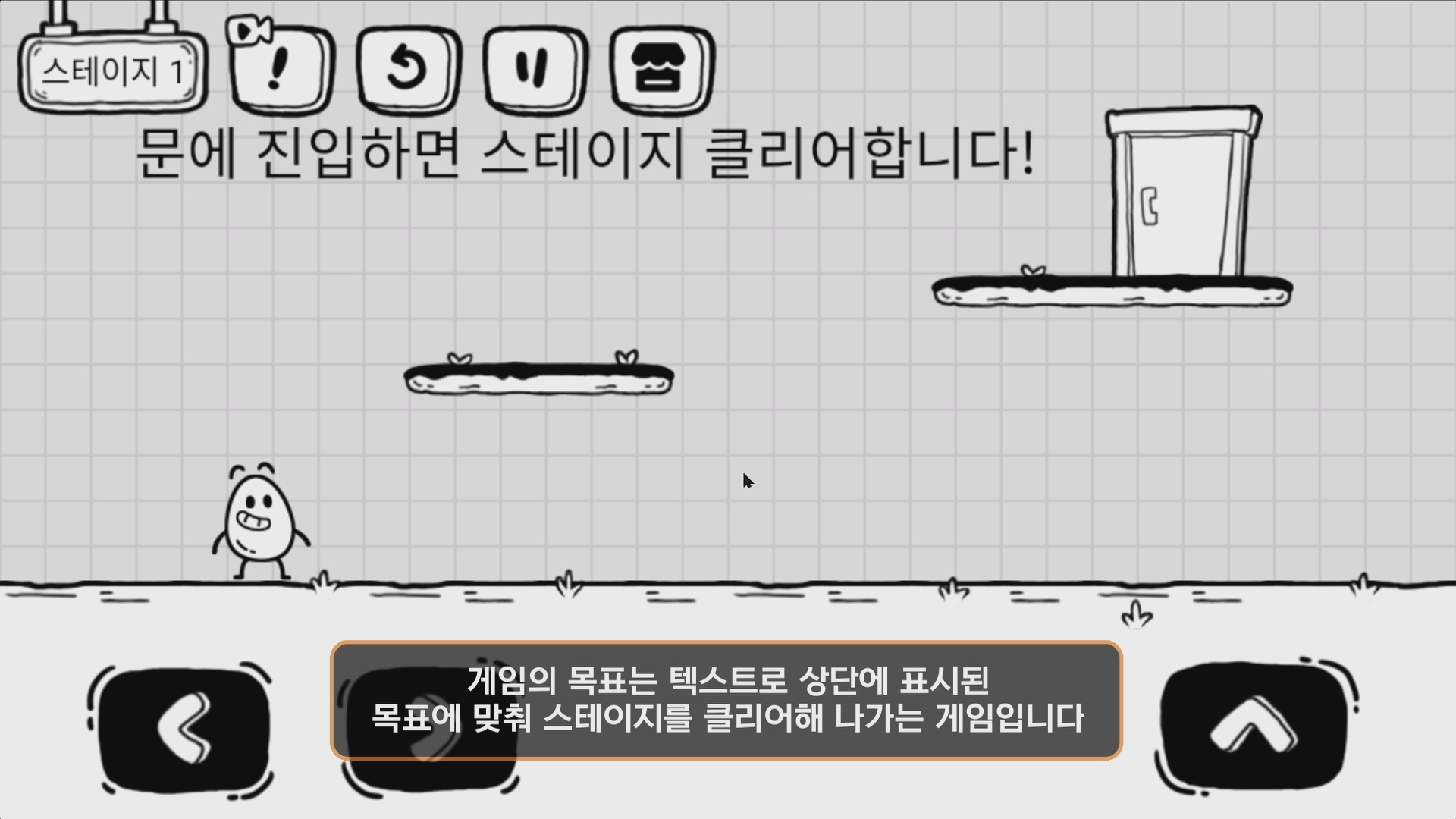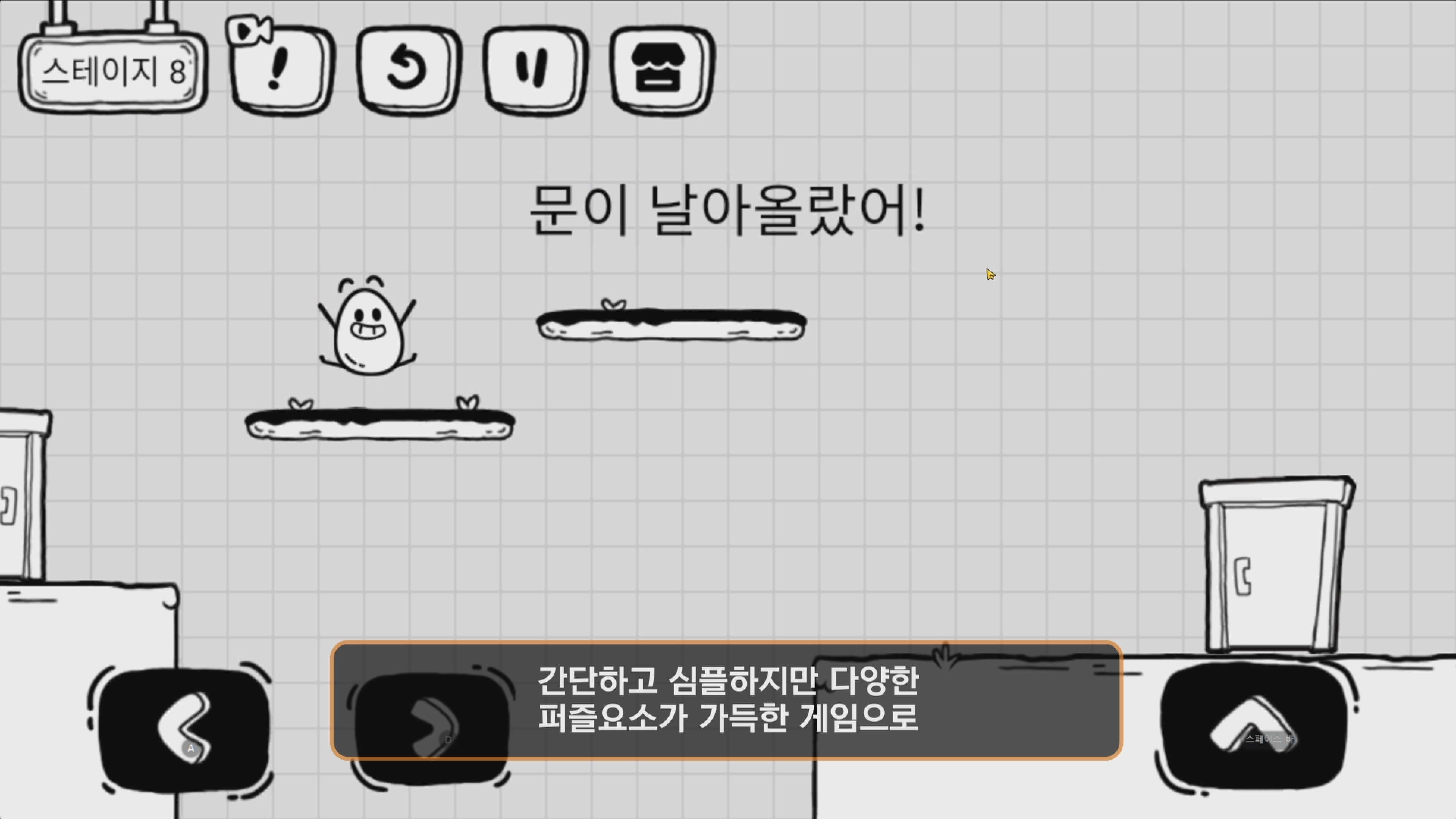 게임 방법은 단순하게 좌우로 이동 점프를 제공하는데요. 단순히 이동하고 점프해서 다음 문으로 들어가는것 을 목표로 하는것만이 아니라 터치와 사물을 활용해 퍼즐요소를 풀어나가는 다양한 요소들이 존재합니다.