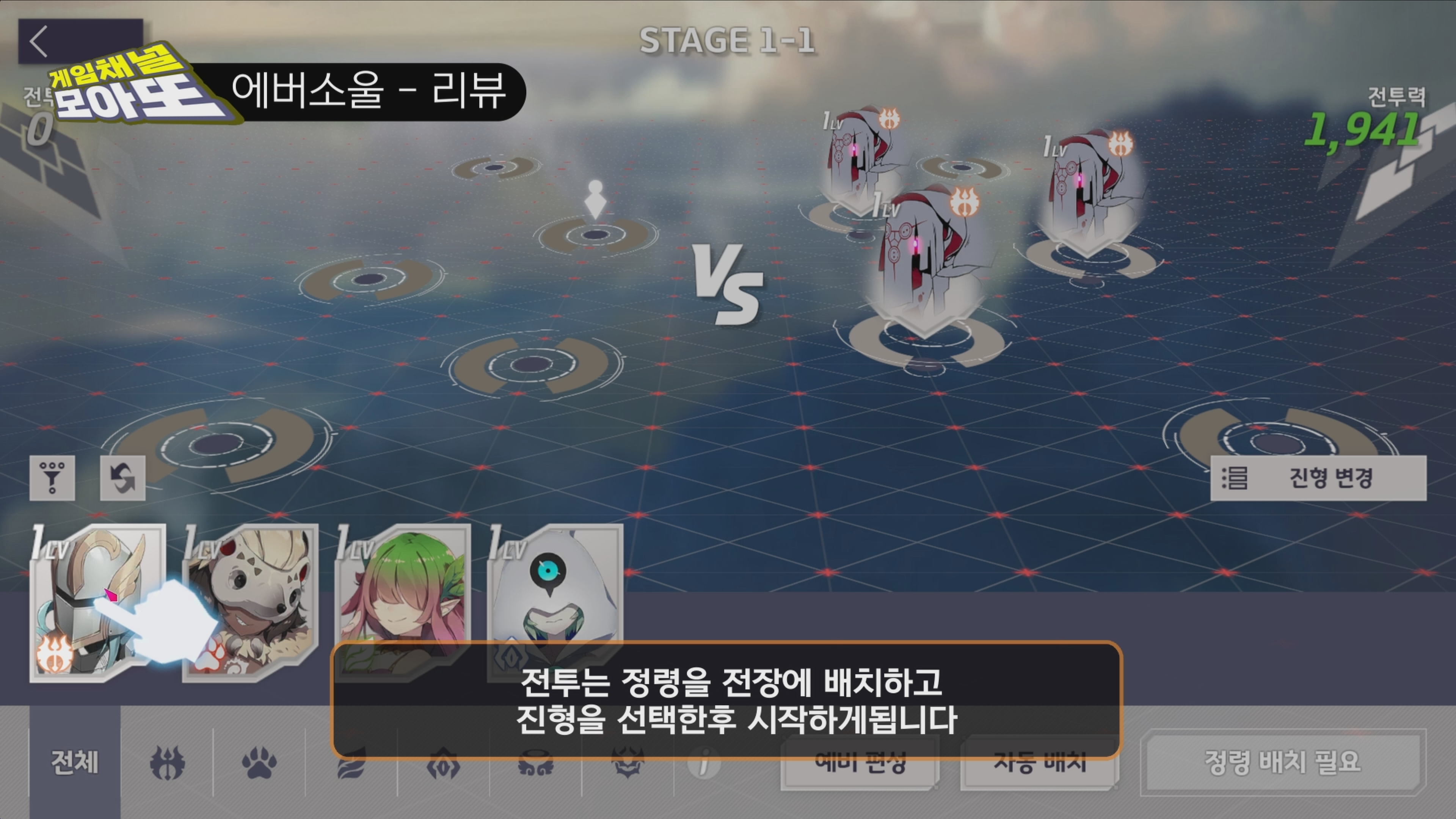 전투는 전장에 정령을 배치하고 시작하게되고 진형을 선택할수있습니다. 진형에 따른 버프효과가 존재하고 정령 계열에 따른 배치에 따라 시너지 효과가 다릅니다. 계열별로 클래스별로 전방 후방을 잘 배치하면 조금더 수월하게 게임 진행이 가능해지는 전략적 요소가 존재합니다.