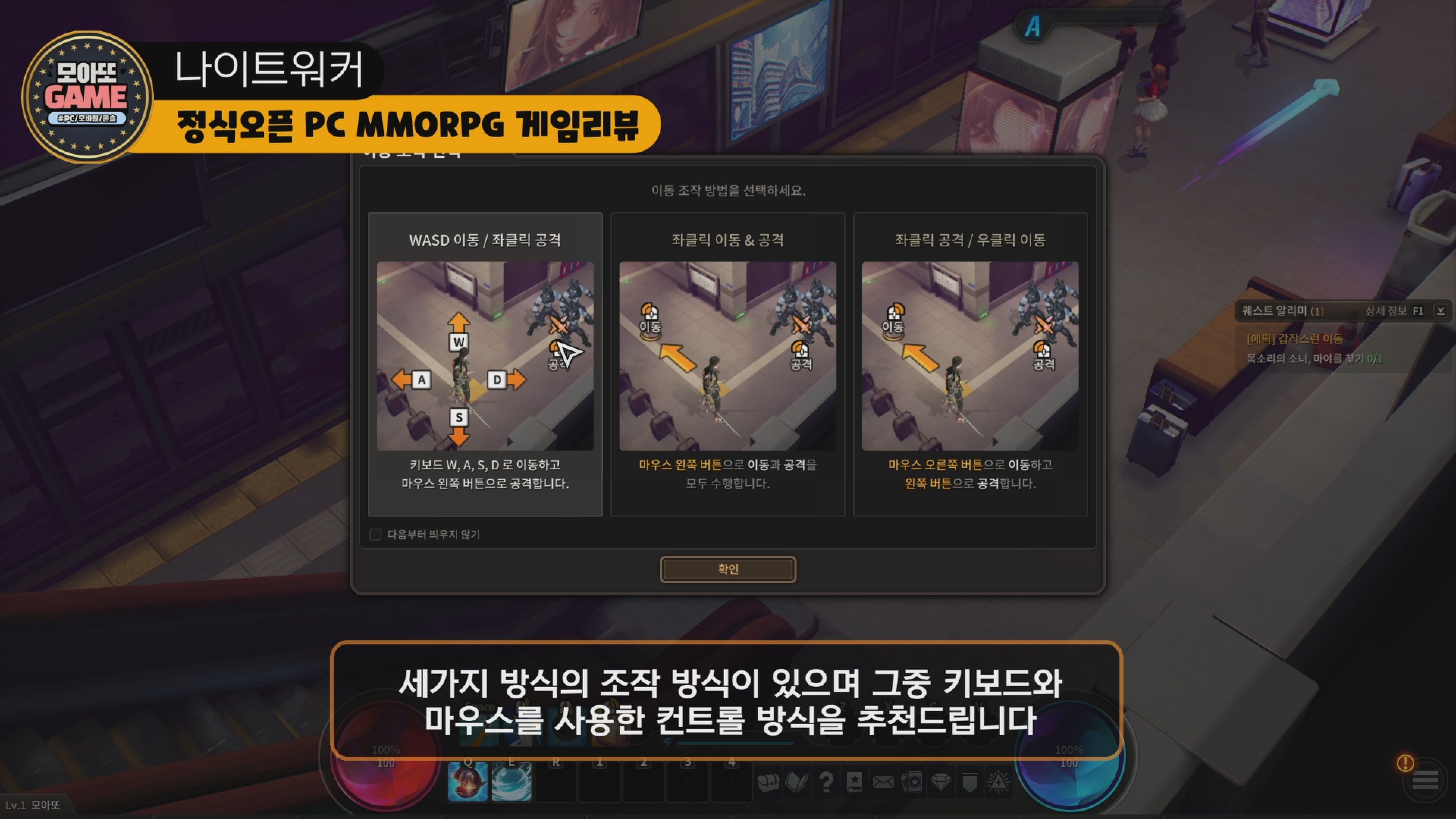 나이트워커는 시작과 함게 컨트롤 방식을 선택하라는 튜토리얼을 진행하게됩니다. 세가지 조작방법이 있는데요. 대부분 추천하는 방식은 키보드와 마우스를 같이 쓰는방식입니다. 횡스크롤 방식의 단순한 게임이 아니고 대각선 이동이 필요하고 논타겟 스킬도 사용해야하므로 키보드 마우스 혼합방식이 여러모로좋다고생각합니다.