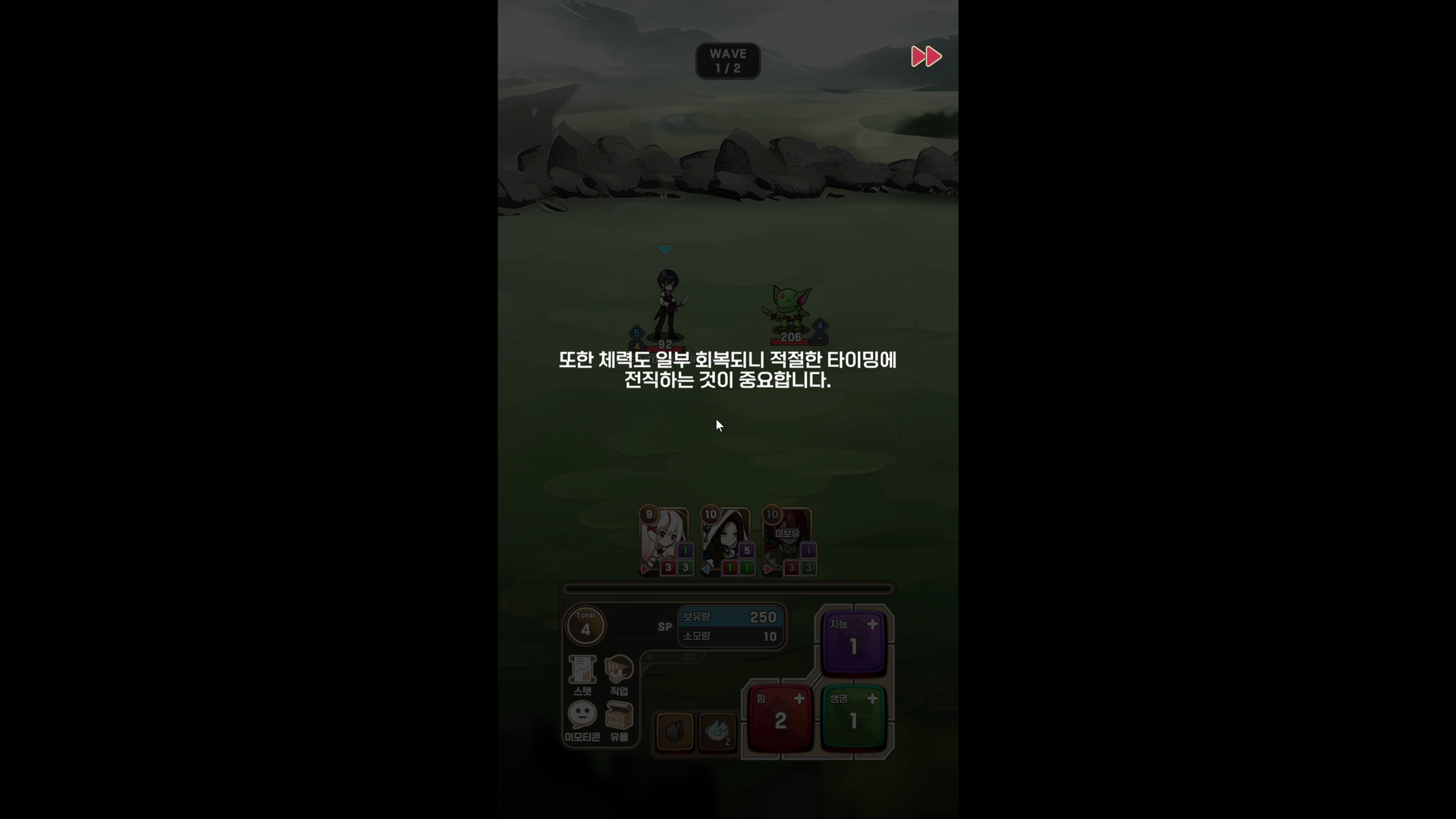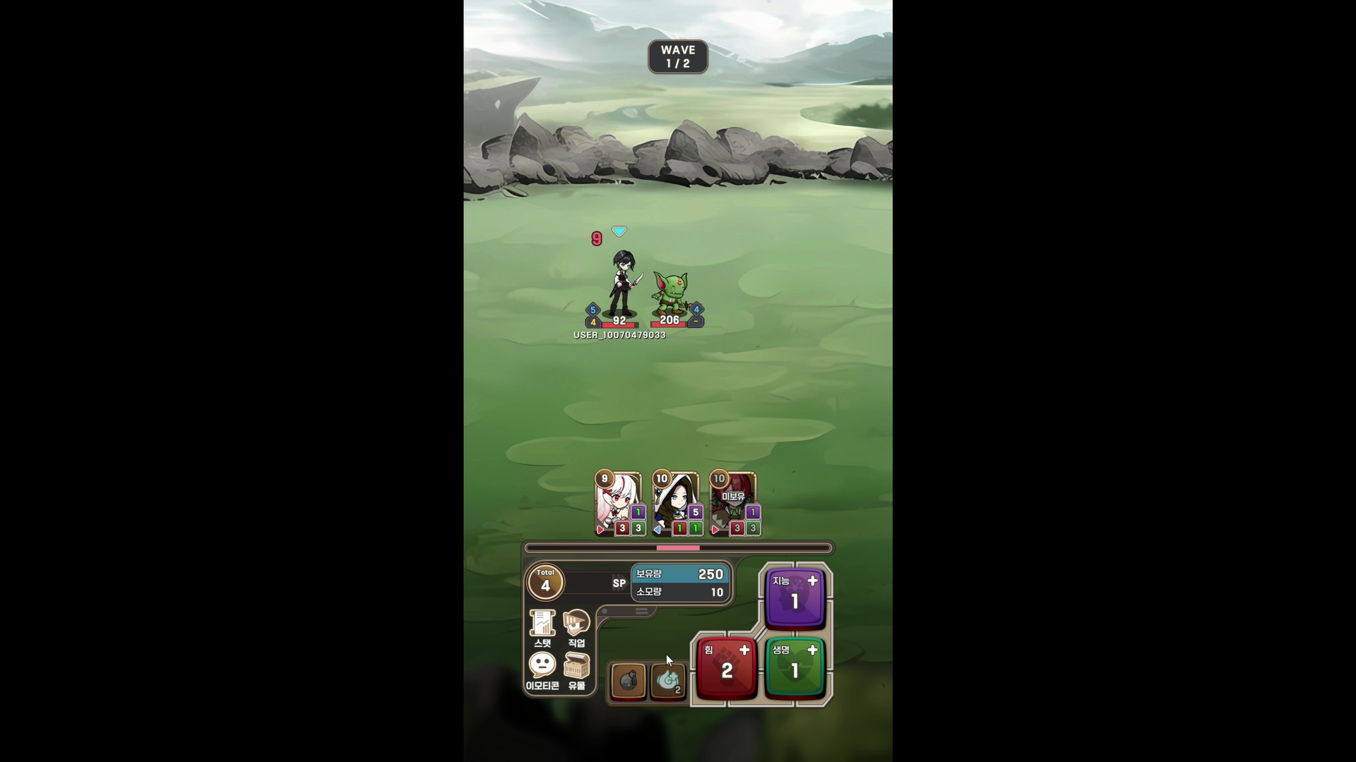 각 턴마다 sp를 사용하여 공격, 방어, 체력을 레벨업하고 다양한 유물을 획득하며 전투를 진행합니다.