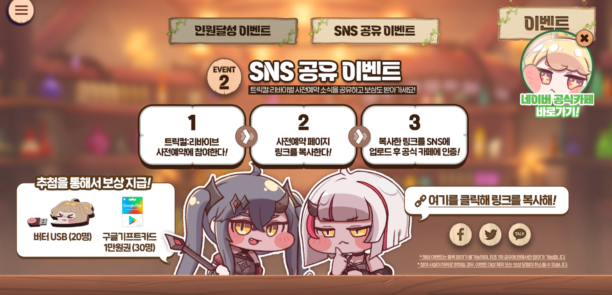 2번의 클로즈 베타를 거쳐 유저들의 호응과 호평에 힘입어 다시 돌아오게된 트릭컬은 사전예약을 통해 달성 이벤트및 누적 이벤트를 통한 게임내 재화를 보상으로 받아보실수있으며, sns 공유 이벤트를 통해 구글 기프트카드와 버터USB들의 상품도 추첨을통해서 받아보실수있습니다.