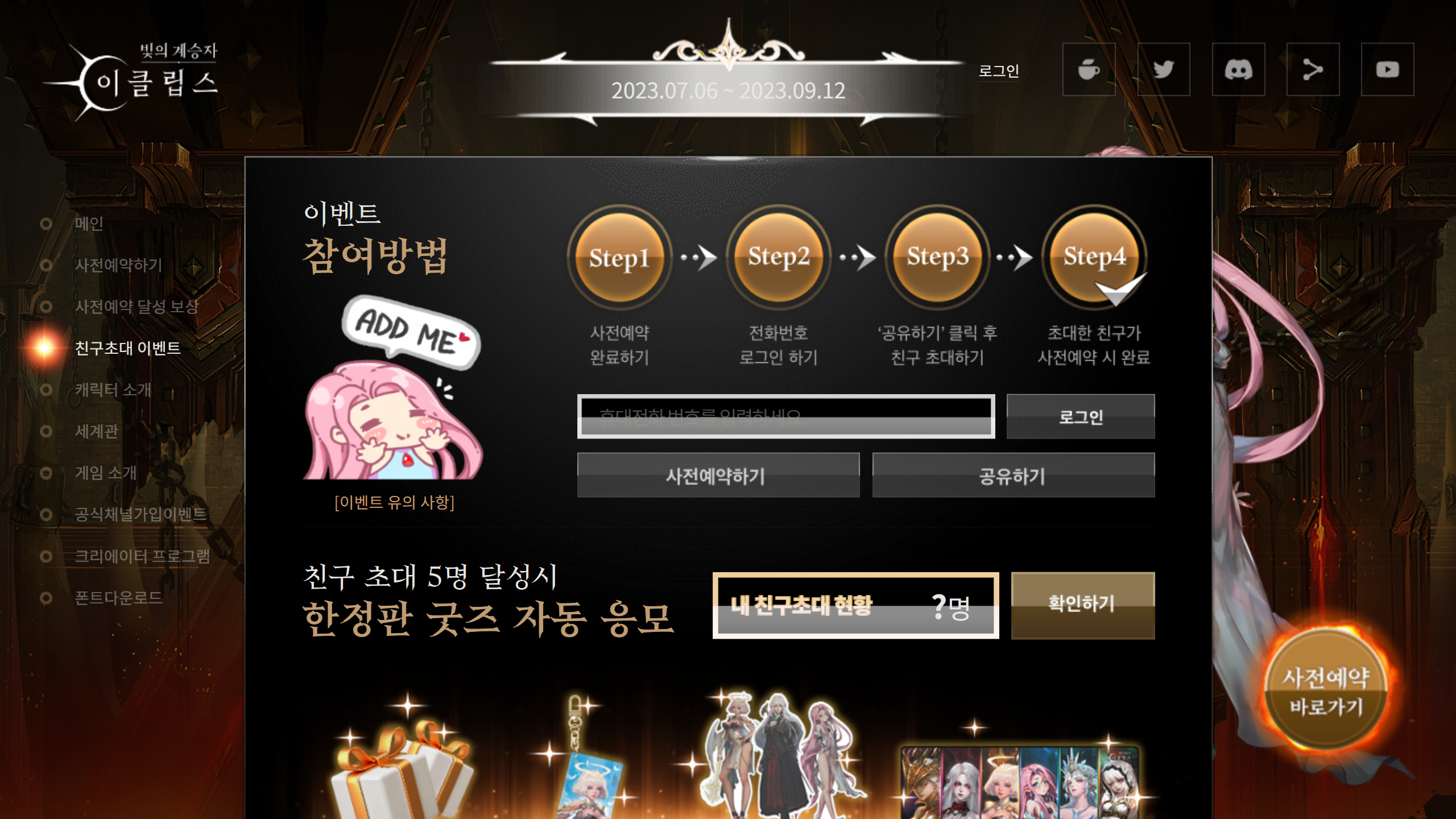 마지막으로, 게임의 사전예약 정보를 알려드리겠습니다. 빛의 계승자: 이클립스는 현재 사전예약에 들어갔습니다. 사전예약은 공식 홈페이지나 구글 플레이 스토어, 애플 앱스토어를 통해 가능합니다. 사전예약자 수에 따라 풍성한 아이템과 에픽 등급 캐릭터인 테레지아를 선물로 받을 수 있습니다. 또한 친구 초대 이벤트를 통해 한정판 굿즈에 응모할 수도 있습니다. 빛의 계승자: 이클립스에 관심이 있으시다면, 지금 바로 사전예약에 참여해보세요.