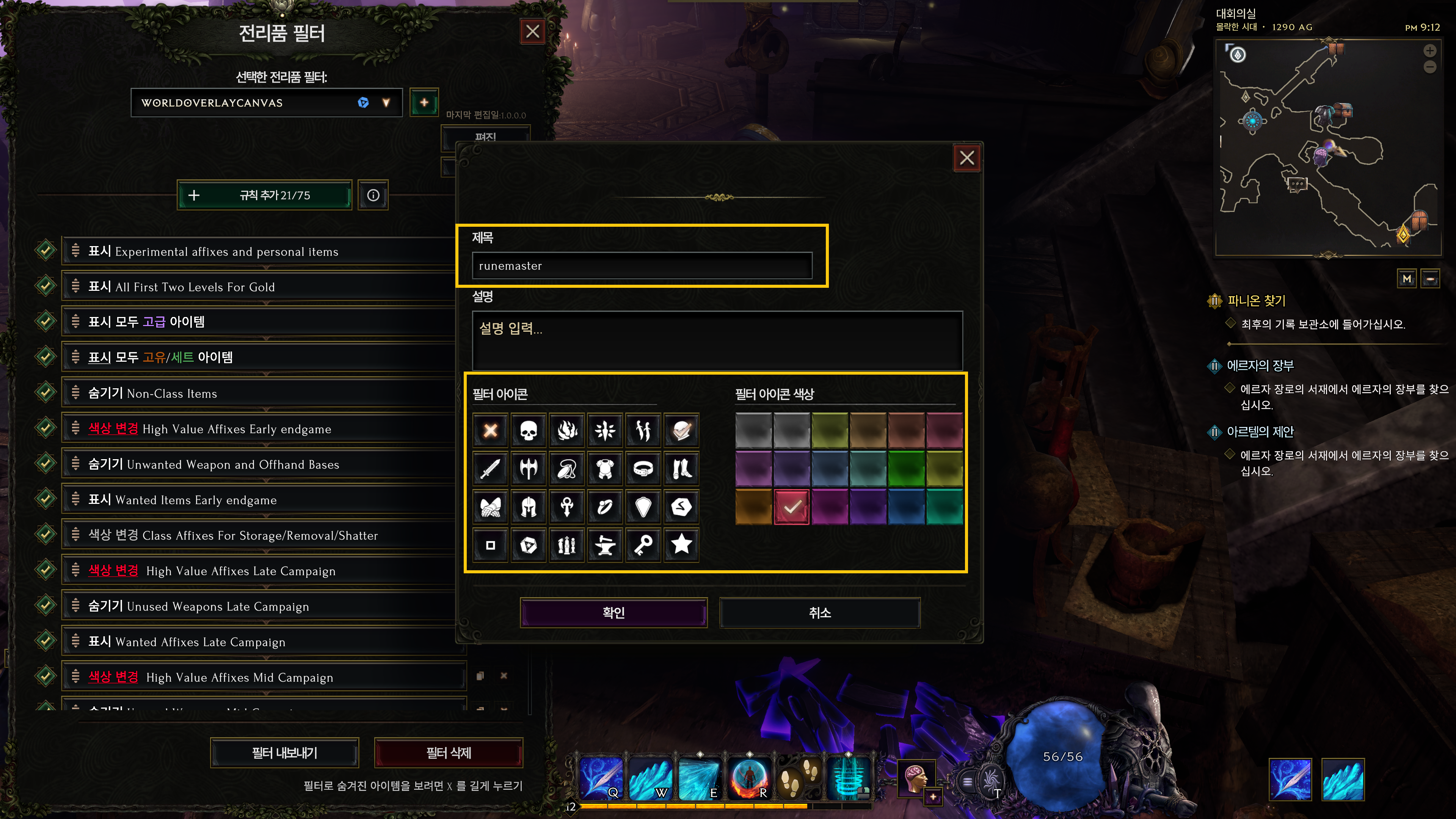 다시 설정-> 게임플레이 옵션에 필터란에 자신이 지정한 이름과 아이콘 색상이 잘 적용되었는지 확인하시면됩니다.