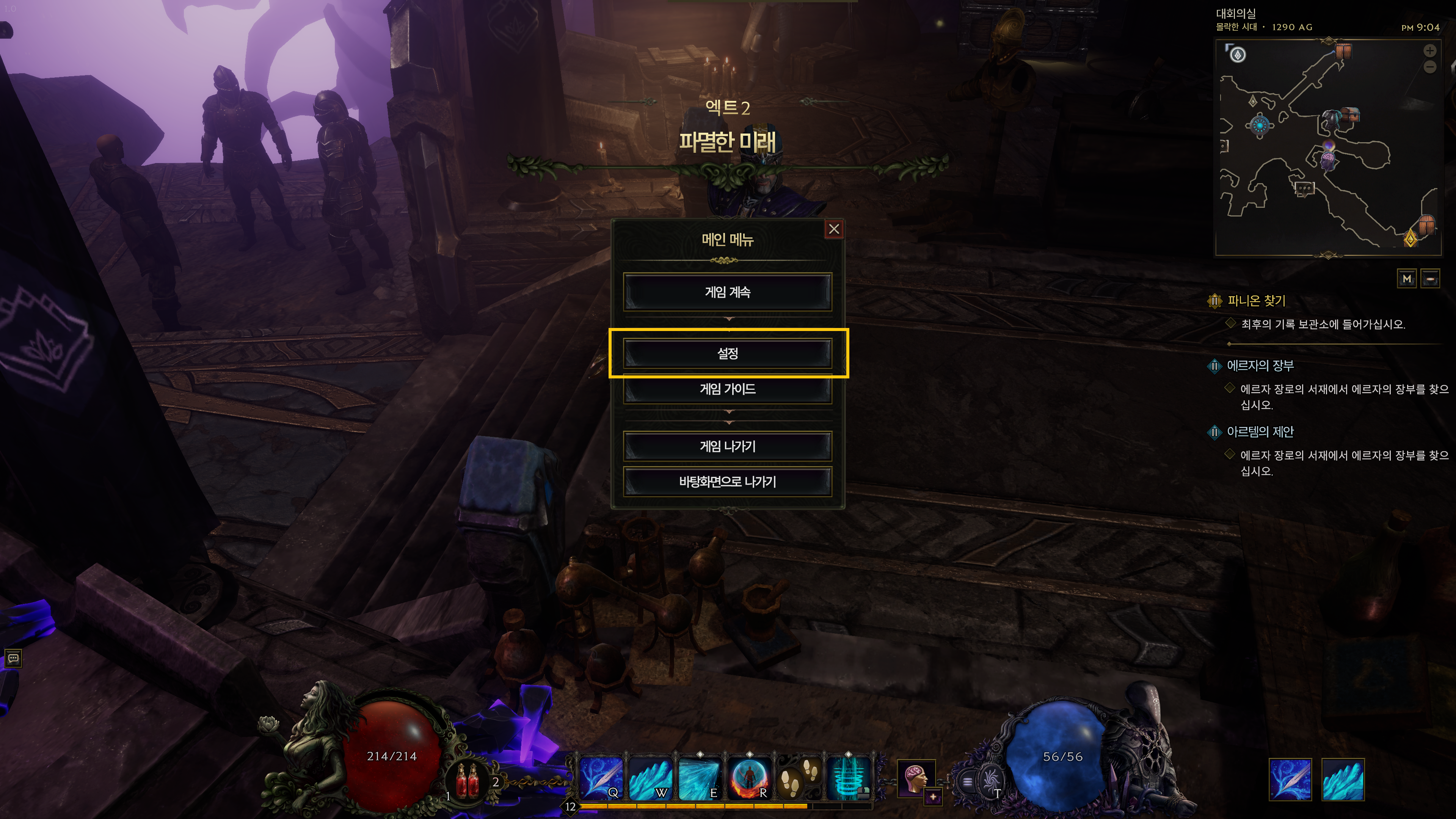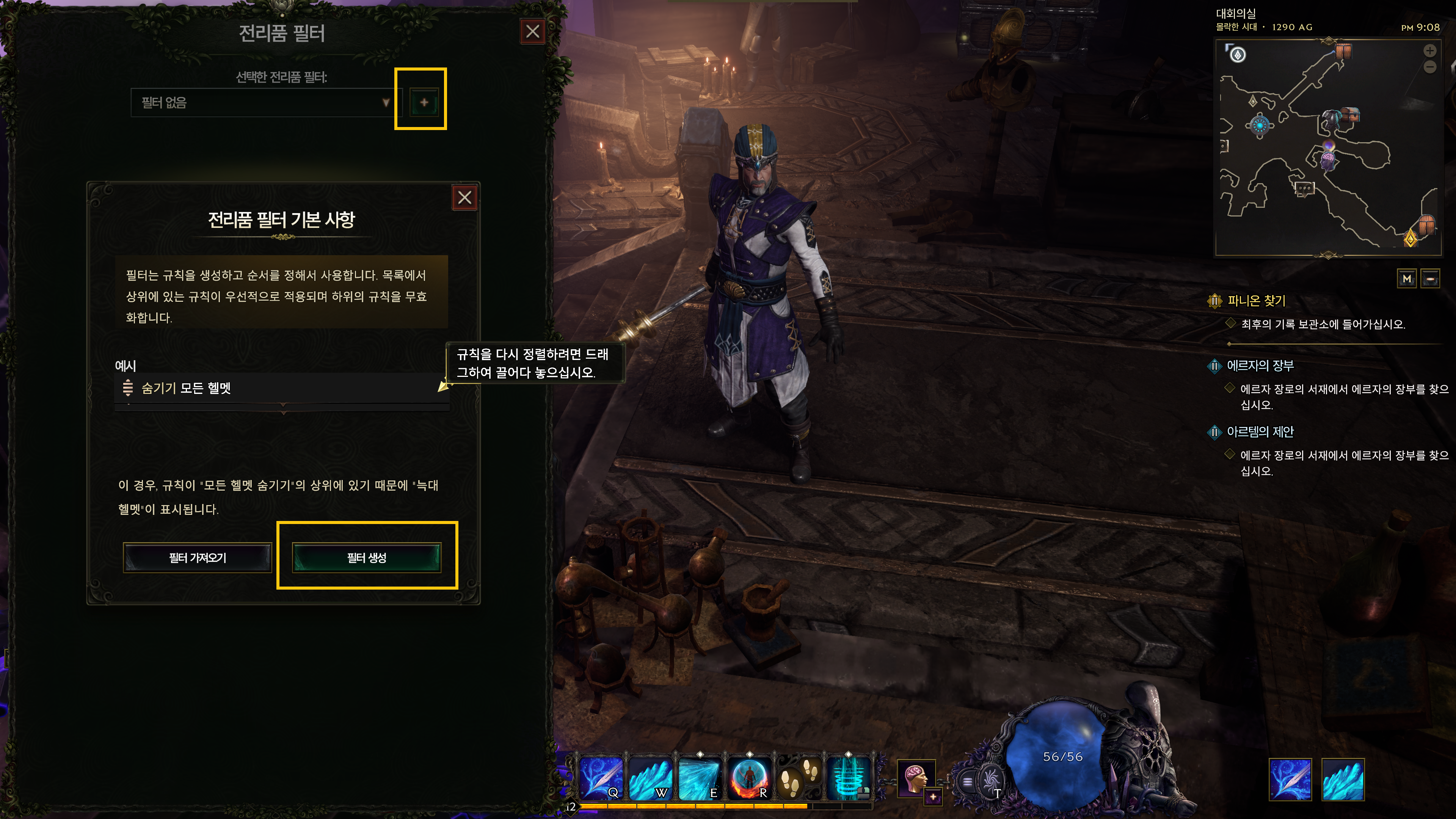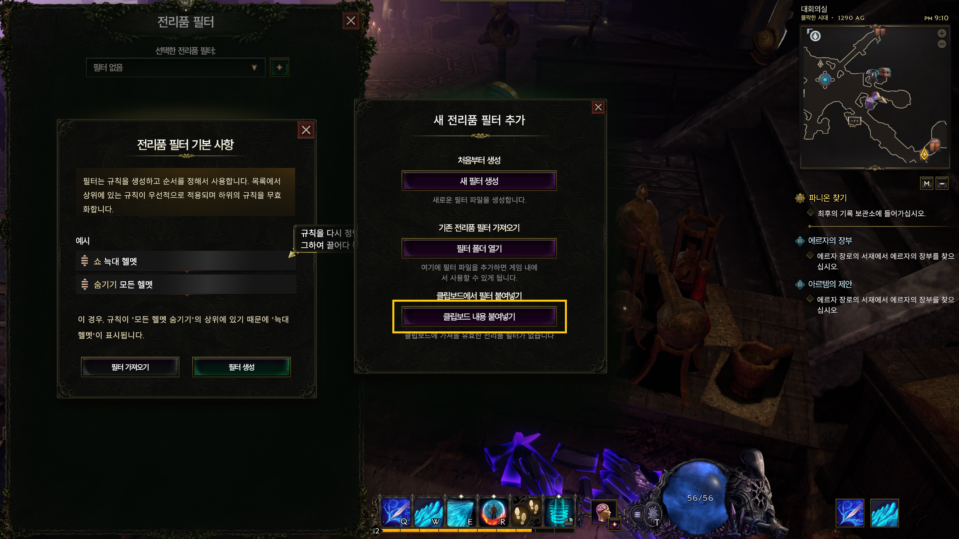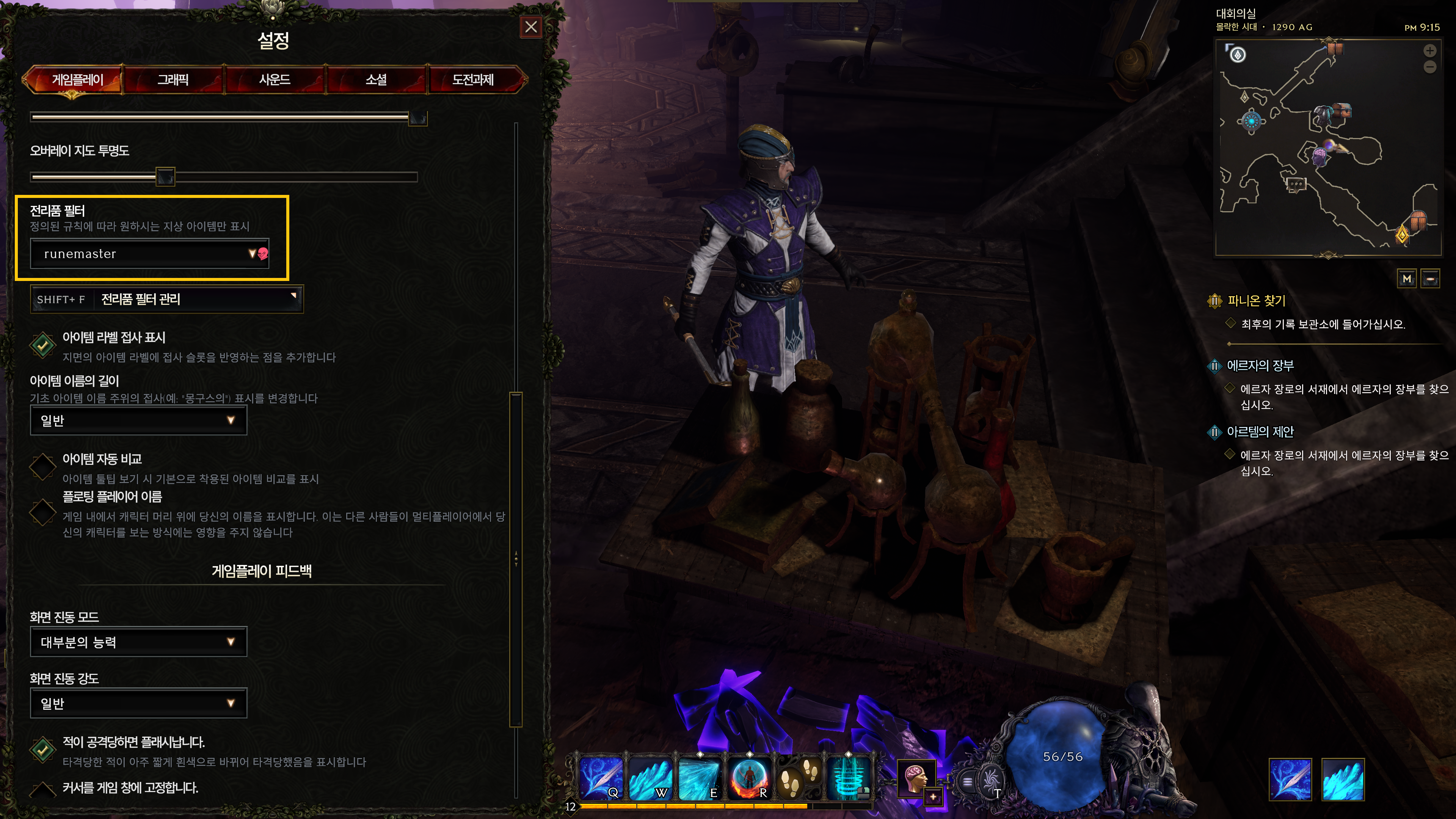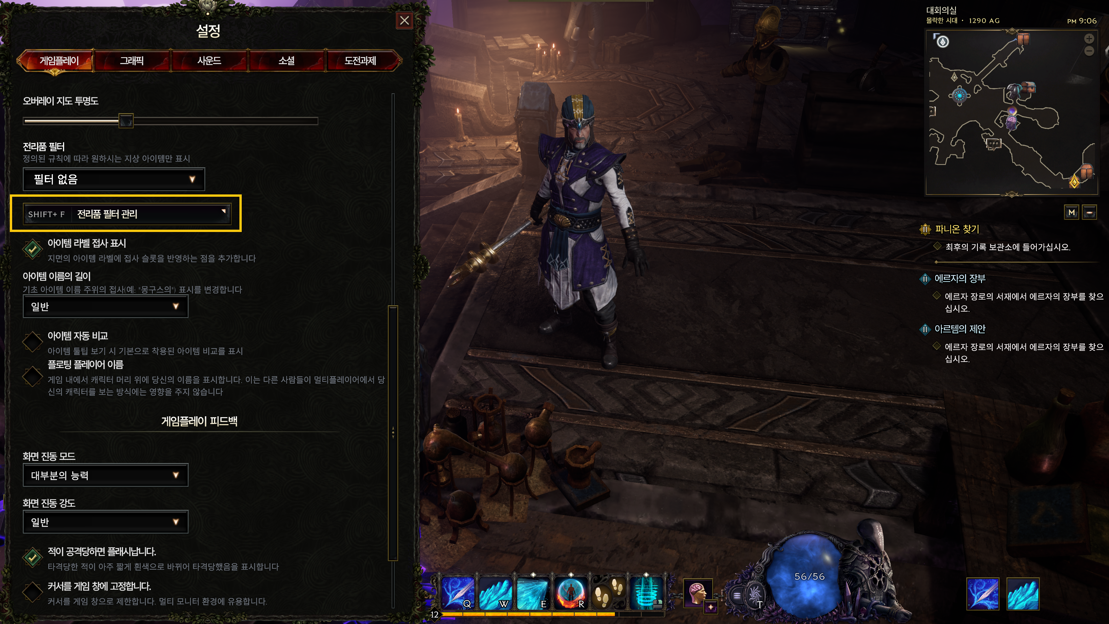게임으로 돌아와 ESC를 누르고 설정->게임플레이 옵션으로 이동하여, 아래로 내려보면 전리품 필터 관리가 보입니다. 해당 설정을 클릭해서 들어가주세요.