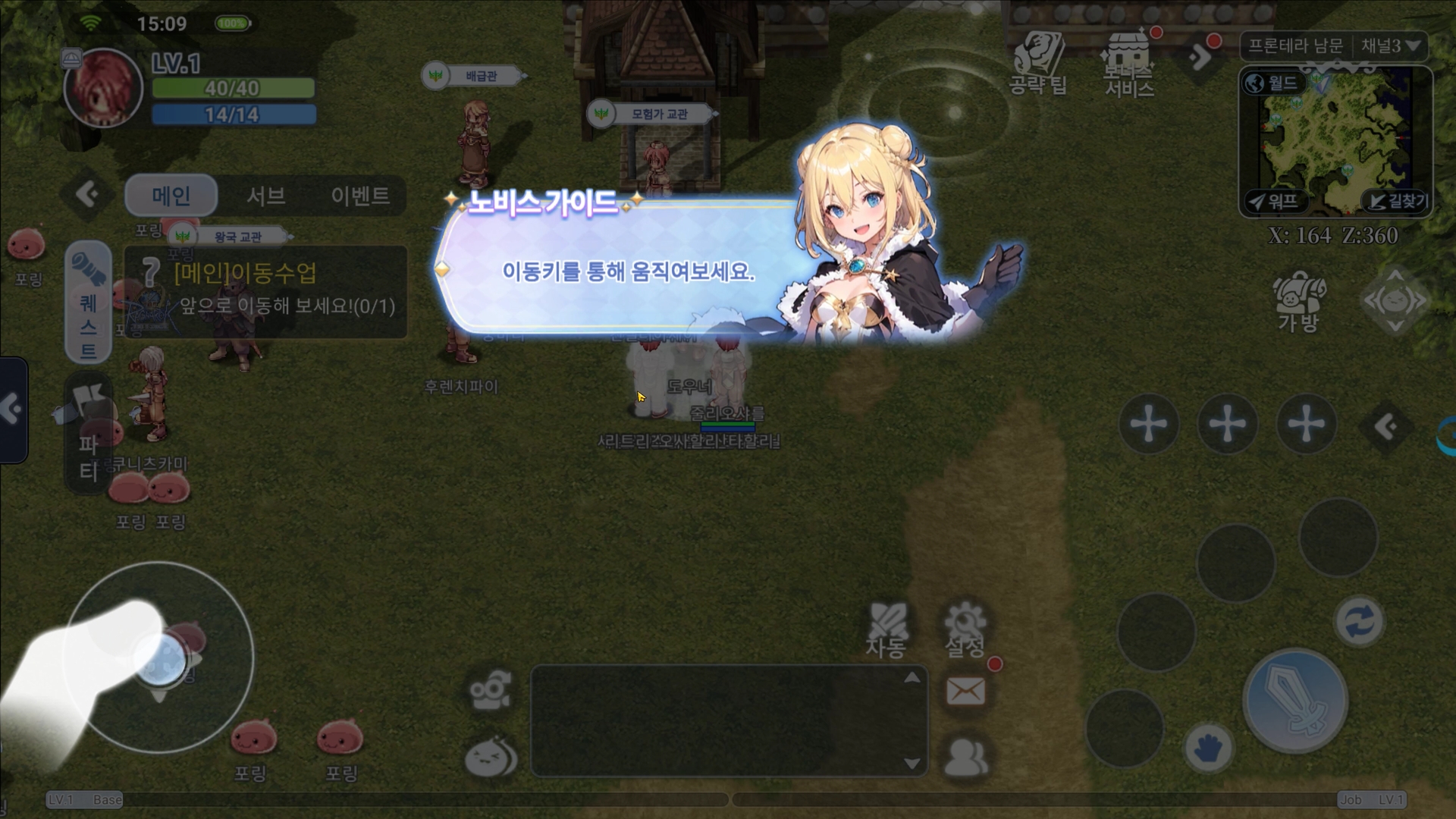 좌상단 퀘스트 알리미를 터치하면 자동으로 진행되고 부가퀘스트나 성장퀘스트또한 옆에 작게 팝업되어 선택할수있습니다. 다른 모바일게임과 다를바없는 형태로 진행되고, 가상패드와 터치를 통해 이동이가능합니다.