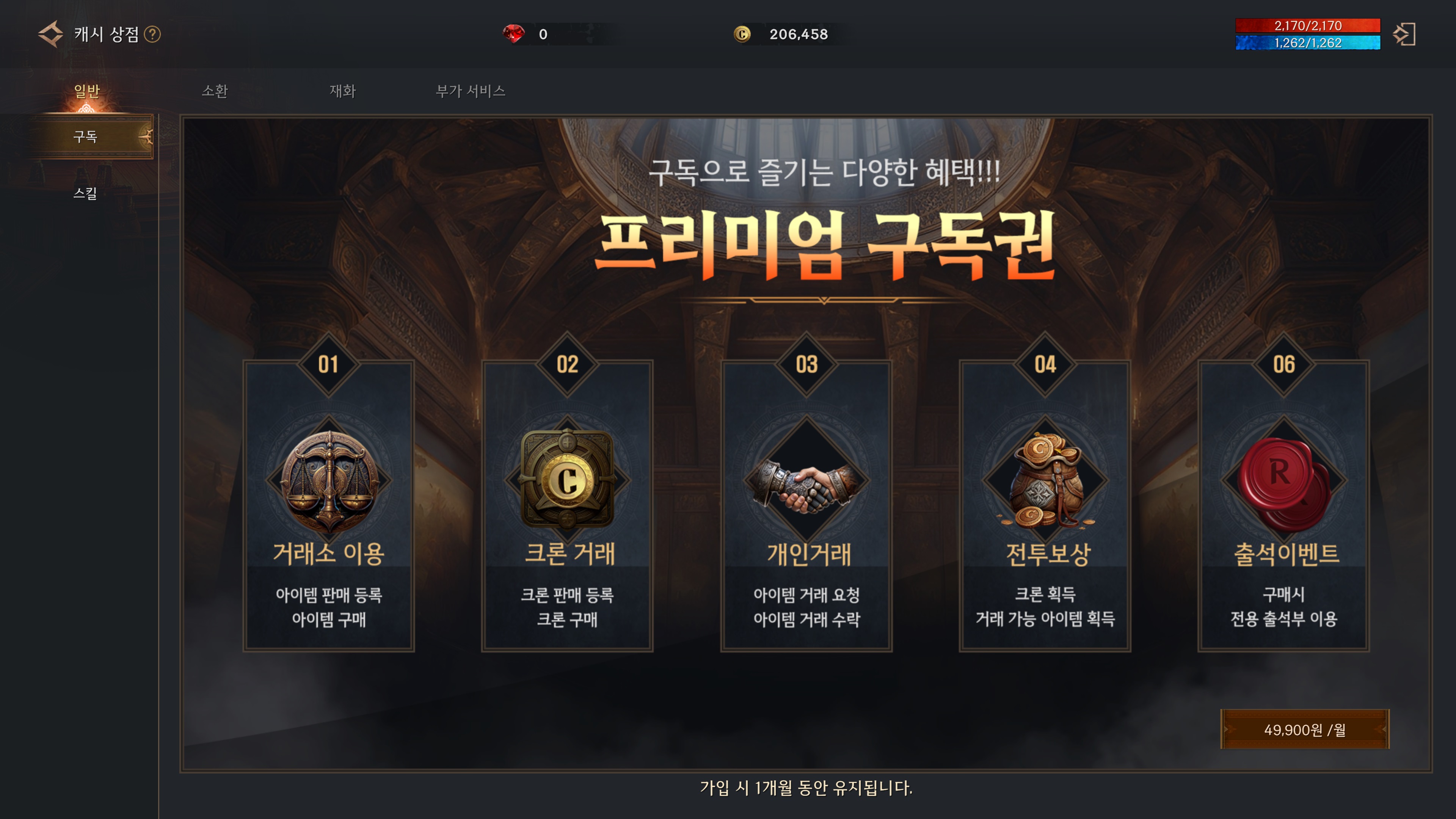 월정액 구독권을 팔고있습니다. 홈쇼핑 장난질에서 습득한 뒷자리 바꾸기상술로 5만원은 민망했는지 4만9천900원에 팔고있습니다. (4만9천9백9십9원에 팔지왜?) 여튼 구독권을 구매하지 않으면 하루 자동사냥시간이 제한되는데요. 더불어 구독권이 없으면 거래가 안됩니다. 구독권이 없으면 비거래 물품만 드랍되고 거래가 안되기때문에 그냥 솔플게임 하듯이 하루에 제한된 시간만 즐기실분들만 할수있죠. 작업장을 방지하기 위해 도입되었다고하는것 같은데 유저들 진입도 막았습니다. 무과금유저가 있어야 과금유저가 돈을쓰고 우월감을 느끼게되는데 무소과금유저들조차 등돌리게 만든 구독권 시스템으로 인해 거래소에는 매물이 없고 일부 남아있는 유저들만 소량의 거래가 진행되고있습니다. 돈을내고 게임을해서 쌀먹을 하고자 하는 유저들에게는 높은 진입장벽 투자대비 수익기대값이 몹시 낮아지죠.