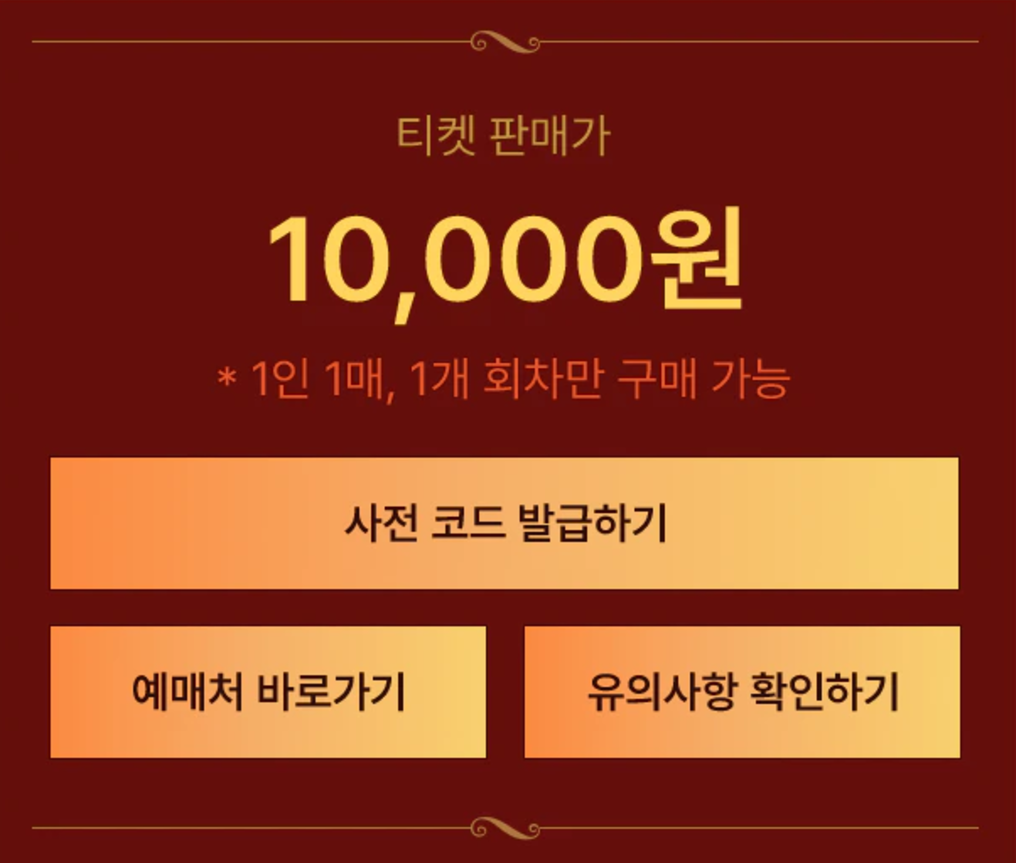 티켓 가격은 1만 원이며, 참여를 원하는 모험가는 11월 27일부터 12월 4일까지 로스트아크 공식 홈페이지에서 사전 코드를 발급받아야 합니다. 이후 12월 4일 오후 4시부터 인터파크 티켓에서 사전 코드 인증을 완료한 뒤, 12월 6일 낮 12시부터 티켓 예매를 진행할 수 있습니다. 참여 대상은 전투 레벨 60 이상을 달성한 모험가로 제한되며, 1인당 1매, 1회차만 예매 가능합니다.