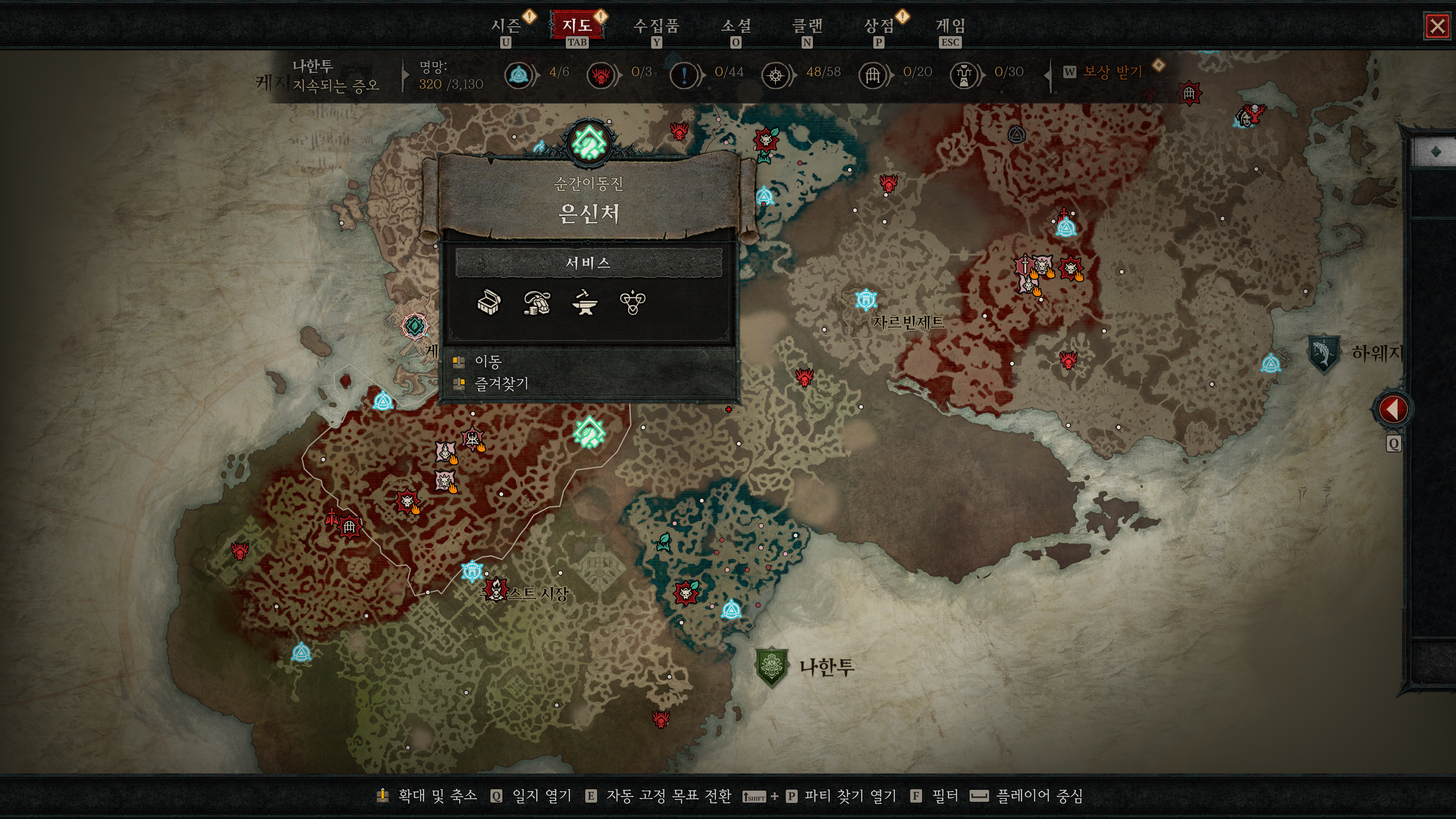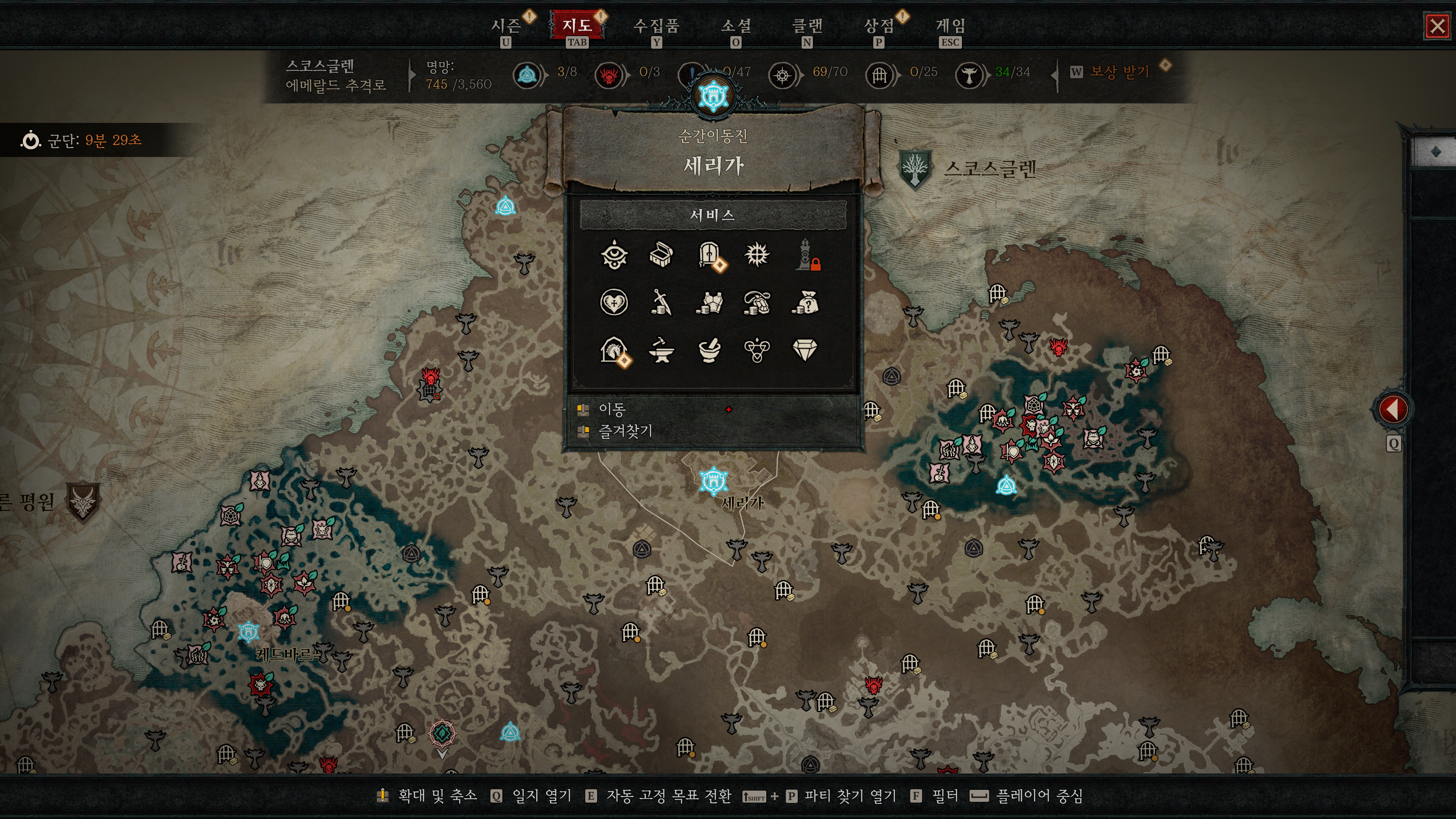 지도 상에 초록색으로 표시된 지역이 7시즌 지역인 머리사냥 지역입니다. 이곳에서 속삭임 퀘스트를 병행하여 아이템보상과 함께 시즌 컨텐츠인 마녀술에 관련된 포인트를 획득하게됩니다.