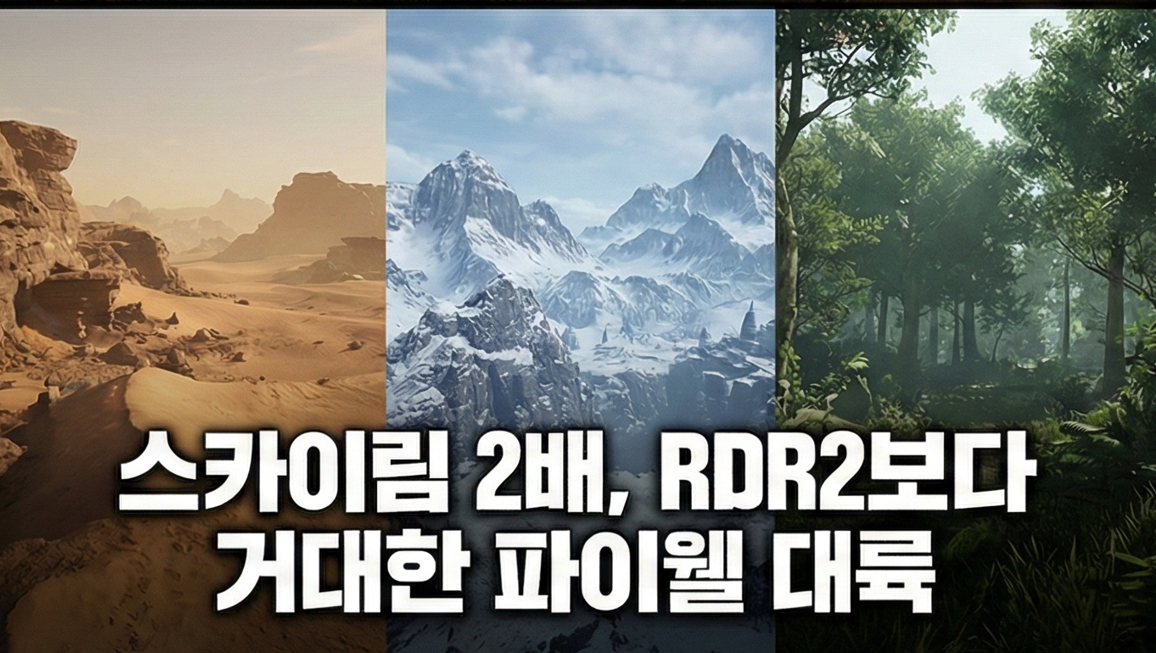 오픈월드 게임에서 세계의 크기는 꽤 중요한 요소예요. 펄어비스 미국법인의 홍보총괄은 한 인터뷰에서 "파이웰 대륙의 크기는 엘더스크롤: 스카이림의 2배 이상이며, 레드 데드 리뎀션2보다 거대하다"고 밝혔어요. 스카이림과 레드데드리뎀션2는 오픈월드 게임 중에서도 특히 넓기로 유명한 게임들인데, 그보다 크다는 얘기니까 규모가 얼마나 방대한지 상상이 가시나요?
