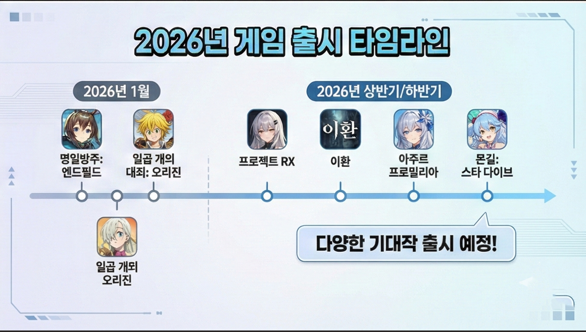 공장 시뮬레이션 + 미소녀 전략 RPG = 엔드필드, 애니메이션 세계관 오픈월드 어드벤처 = 일곱 개의 대죄: 오리진, 이런 식으로 자신의 취향에 맞는 게임을 먼저 골라보세요. 그러다 보면 어느새 서브컬처 게임의 매력에 푹 빠져있을 거예요! 앞으로 출시될 프로젝트 RX, 무한대, 이환도 계속 기대해봐도 좋아요. 2026년은 정말 서브컬처 게이머들에게 천국 같은 한 해가 될 것 같네요! 😄