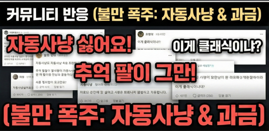 자동사냥 없는 수동 플레이, 월 정액제 단일 과금, 클래식 본연의 감성. 이 세 가지가 유저들이 리니지 클래식에 기대했던 핵심 약속이었어요. 그런데 정식 서비스 첫날부터 자동사냥 ATS가 도입됐고, 캐시템이 등장했고, PC방 혜택은 줄어들었죠.