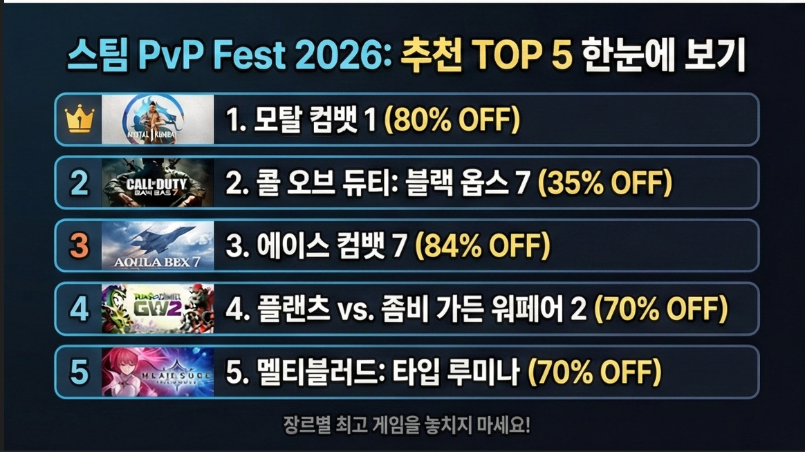 지금까지 스팀 PvP Fest 2026에서 주목할 게임 다섯 가지를 소개해드렸어요. 격투 게임부터 FPS, 전투기 게임, 팀 슈팅까지 장르가 다양하니 내 취향에 맞는 게임을 하나쯤은 찾을 수 있을 거예요. 할인 기간이 2월 16일로 얼마 남지 않았으니 관심 가는 게임이 있다면 지금 바로 스팀 스토어에서 확인해보세요! 이 가격에 이 퀄리티, 정말 지금이 찬스랍니다 😊