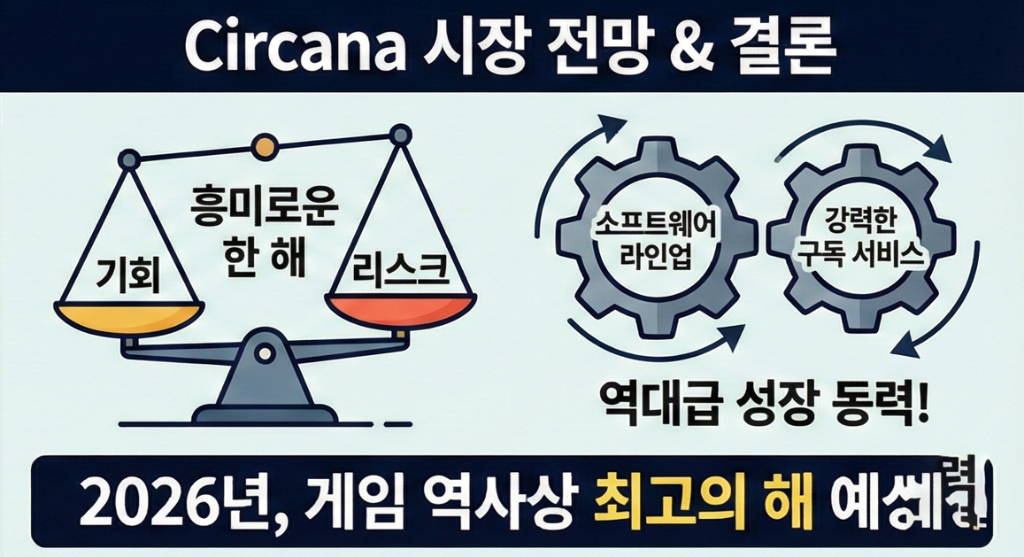 자, 지금까지 살펴본 내용을 한 번 정리해 볼게요. 2026년 미국 게임 시장은 GTA 6와 닌텐도 스위치 2라는 두 거인의 쌍끌이 덕분에 역대 최고 매출인 628억 달러 돌파를 목표로 달려가고 있어요. Circana의 게임 산업 애널리스트 맷 피스카텔라는 "2026년 미국 게임 시장은 엄청난 기회와 리스크를 동시에 안고 있다"면서, "뛰어난 소프트웨어 라인업과 강력한 구독 서비스를 고려하면 굉장히 흥미로운 한 해가 될 것"이라고 말했어요.