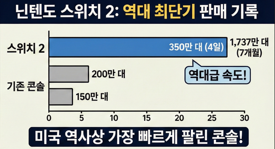 닌텐도 스위치 2는 2025년 6월 5일에 전 세계에 출시됐는데요, 반응이 정말 폭발적이었어요. 닌텐도는 출시 4일 만에 스위치 2가 전 세계적으로 350만 대 이상 판매되어, 닌텐도 역사상 가장 빠르게 판매되는 콘솔이 되었다고 밝혔어요. 그리고 미국 역사상 가장 빠르게 판매된 가정용 콘솔이 되었으며, 출시 7개월 만에 그 기록을 달성했어요.