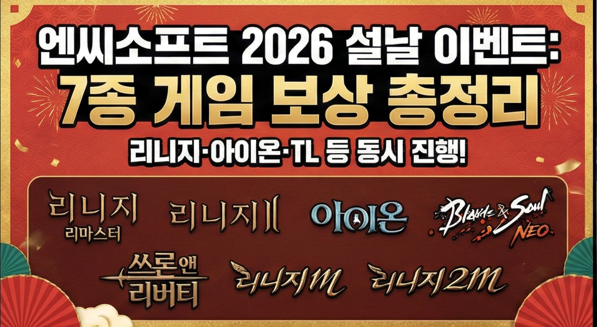🐎 2026년 설날, 떡국 한 그릇 먹고 게임 켜셨나요? 엔씨소프트가 이번 설 연휴를 맞아 자사 라이브 게임 7종 전체에서 동시에 이벤트를 쏟아냈어요! 리니지부터 아이온, TL까지 — 어떤 게임에서 어떤 보상을 받을 수 있는지 하나하나 정리해 드릴게요. 처음 게임을 시작하셨거나 오랜만에 복귀하신 분들도 쉽게 이해하실 수 있도록 전문용어는 최대한 쉽게 풀어 설명할게요! 😊