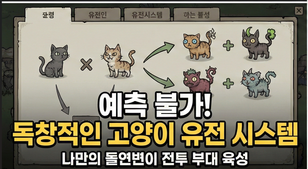 ① 독창적인 고양이 유전 시스템 뮤제닉스에서 가장 화제가 된 건 단연 '유전 및 번식' 시스템이에요. 고양이를 교배시키면 부모의 특성이 자식에게 유전되는데, 예측 불가능한 돌연변이가 발생하기도 해요. 어떤 조합에선 불덩이를 쏘는 마법사 고양이가 태어나기도 하고, 어떤 고양이는 특이한 병을 갖고 태어나기도 하죠. 근친교배를 하면 유전적 결함이 생기기도 하는데, 가끔은 희귀한 능력이 나오기도 한다고 해요. 이 예측 불가능함이 게임의 가장 큰 묘미예요!