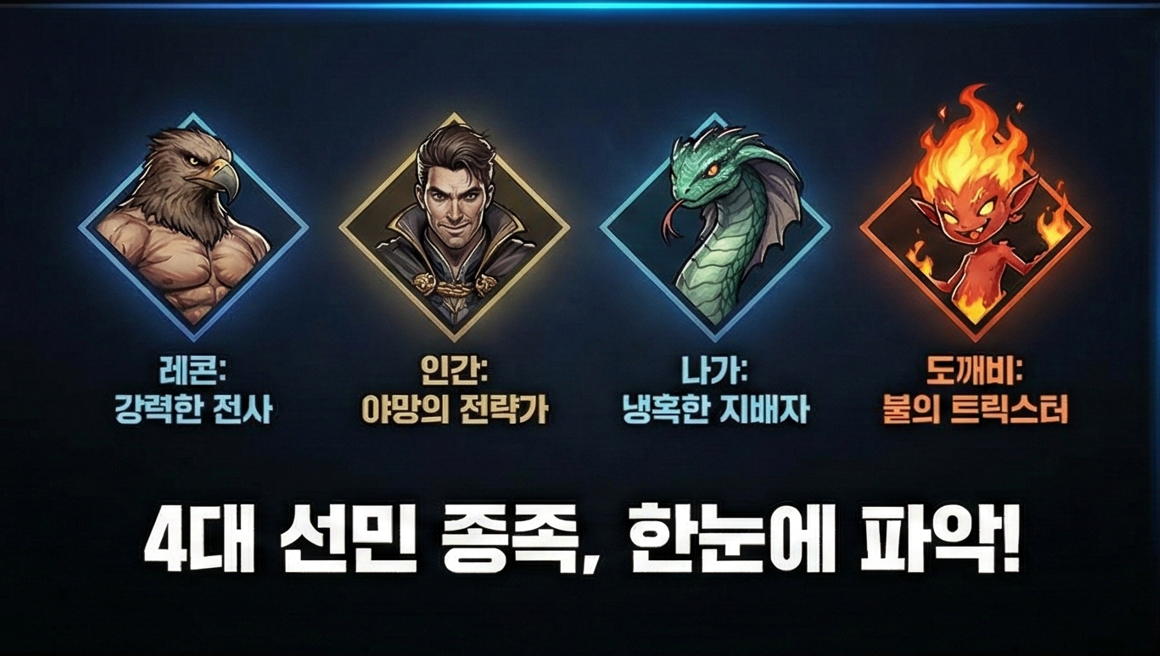 이 세계에서 가장 중요한 게 바로 4개의 선민 종족이에요. 이 세계에는 인간(Humans), 레콘(Rekon), 나가(Nhaga), 도깨비(Tokkebi) 네 종족이 살고 있으며, 각 종족은 고유의 문화, 갈등, 세계관을 가지고 있어요.