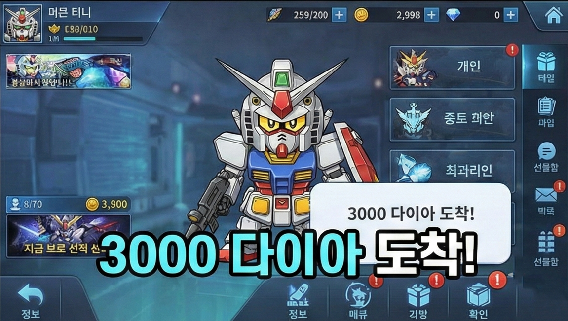 어느 날 갑자기 게임 선물함에 다이아 3,000개가 딱 들어와 있다면? 두근두근하죠? 그런데 막상 어떻게 써야 할지 몰라서 그냥 충동적으로 뽑기 눌러버리는 분들, 사실 꽤 많으실 거예요. 오늘은 SD건담 지 제네레이션 이터널에서 공식으로 선물받은 3000 다이아(뽑기 10회분)를 가장 알차고 효율적으로 쓰는 방법을 같이 알아볼게요! 초보자 분들도 쉽게 이해하실 수 있도록 최대한 풀어서 설명할 테니 편하게 따라오세요 😊
