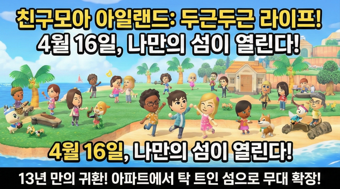어릴 때닌텐도 3DS로 『친구모아 아파트』를 즐겨 하셨나요? 내 친구들을 Mii 캐릭터로 만들어 섬에 넣어두고, 그들이 싸우고 사랑하고 웃는 걸 관찰하던 그 특유의 재미 말이에요! 그 추억의 게임이 무려13년 만에 돌아옵니다.바로 닌텐도 스위치용 신작『친구모아 아일랜드 두근두근 라이프』가 오는4월 16일출시되는데요, 이번엔 아파트가 아닌 탁 트인 '섬'이 무대예요. 그리고 전작과 가장 달라진 점이 뭐냐고요? 바로 내 손으로섬을 직접 꾸밀 수 있다는 것이에요! 오늘은 공식 발표와 닌텐도 다이렉트를 통해 확인된 섬 꾸미기 핵심 기능 7가지를 초보자도 알기 쉽게 정리해 드릴게요. 😊