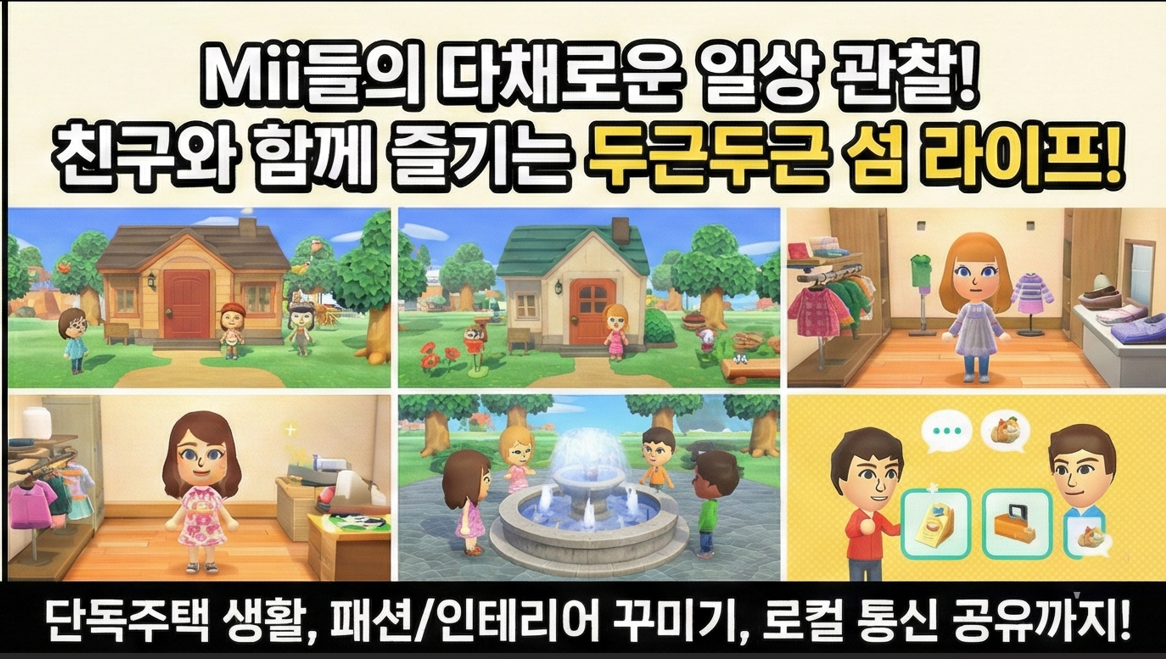 게임이 낯선 분들을 위해 간단히 설명드리면, 이 게임은내가 아는 실제 사람들(가족, 친구, 연예인 등)을 'Mii'라는 귀여운 캐릭터로 만들어 섬에 살게 하고, 그들의 일상을 관찰하는 생활 시뮬레이션이에요. Mii들은 알아서 서로 대화하고, 연애를 하고, 때로는 삼각관계에 빠지기도 한답니다! 😂 플레이어는 이들의 삶에 간접적으로 개입하면서 다양한 이벤트를 즐기는 거예요.