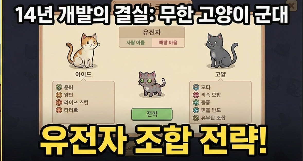 한마디로 정리하면, 고양이를 교배·육성해서 턴제 전술 전투에 내보내는 로그라이크(roguelike) 게임이에요. 고양이 군대를 만들고, 그 고양이들이 가진 유전자와 스킬을 조합해 최강의 팀을 꾸미는 거죠. 들으면 들을수록 신기하죠? 😄
