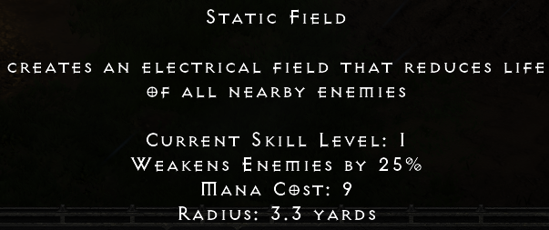 제한적인 범위 내에서 파괴적인 주문인 스태틱 필드는, 근처에 있는 적들의 체력 중 상당한 양을 즉각적으로 감소시켜 버린다. 스태틱 필드로 타격을 받은 적들은 소서리스나 혹은 그녀 일행들의 연이은 공격 앞에 쉽사리 무릎꿇게 될 것이다. 주문 그 자체의 데미지는 적지만 다른 주문이나 근접해서 가하는 결정타와 조함함으로써 소서리스는 강력한 적들조차도 순식간에 없애버릴 수 있는 이 강력한 주문에 기댈 수 있다.