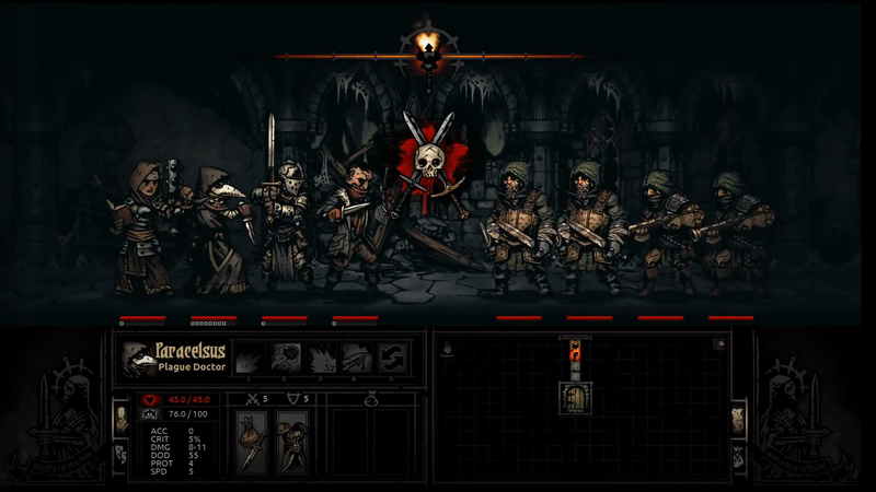 이 게임이 다른 롤플레잉과 구분되는 가장 큰 특징은 "스트레스" 요소의 도입입니다. 불이 어두워지거나 적에게 치명타를 맞는 등 여러가지 부정적인 상황을 마주하면 영웅들은 스트레스를 받게 되며, 그 수치가 100에 달하면 캐릭터는 고통(Affliction) 상태에 들게 됩니다. 이 때 낮은 확률로 고통을 이겨내면 긍정적 능력을 얻을 수도 있지만, 대부분 좌절하고 피해망상, 절망, 공포, 피학증 등 부정적 능력이 발현되는것이 특징이죠.
