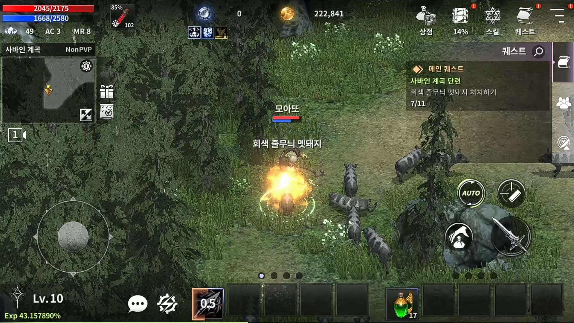 사냥은 타깃을 설정하고 수동공격하거나, 오토버튼을 활성화하여 자동으로 진행가능합니다.
