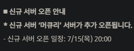 공식포럼의 공지사항을 통해 7월15일 신규서버 오픈소식을 알렸습니다.