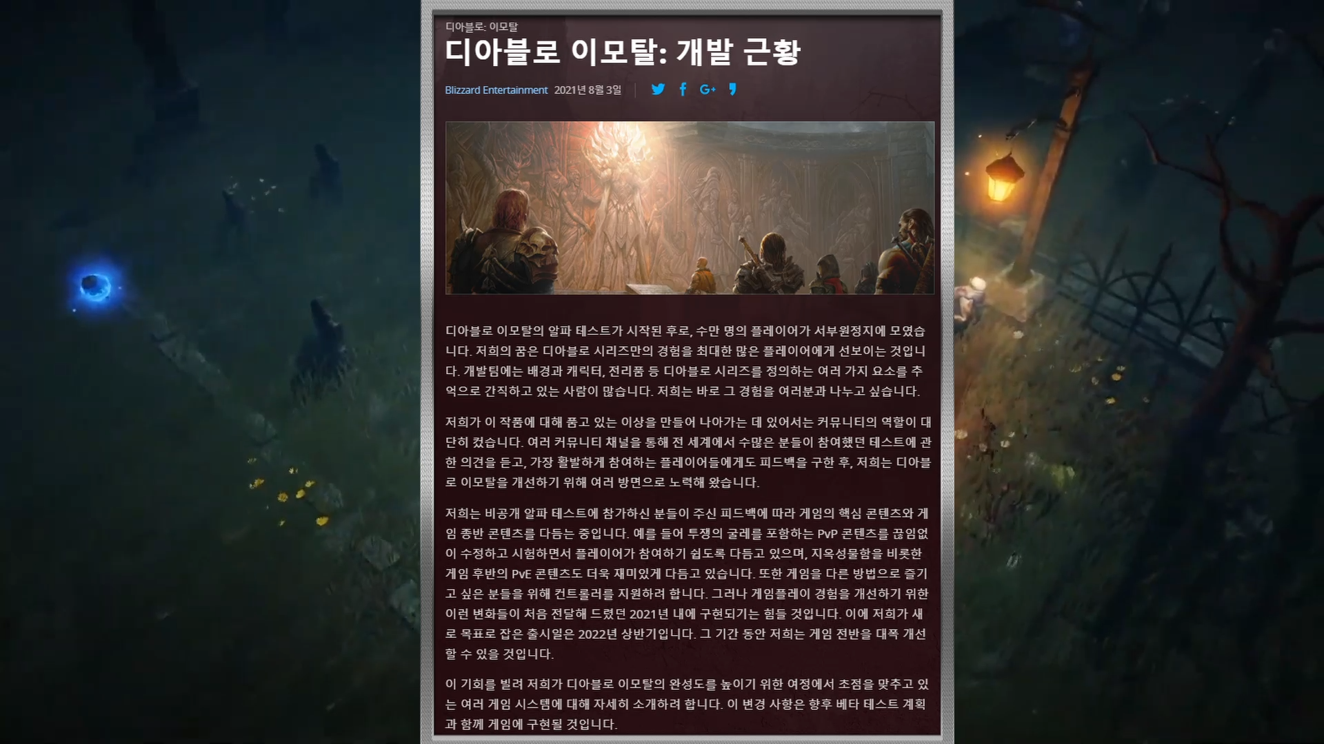 디아블로 모바일 이모탈이 출시연기를 결정했습니다. 2022년 상반기로 연기되었는데요. 더 나은 게임을 위함이라고 하니 기다려봐야겠죠! 추가로 개발자 현황을통해 PVP,컨트롤러지원,캐릭터성장등에 대한 개선사항들도 공개했습니다.