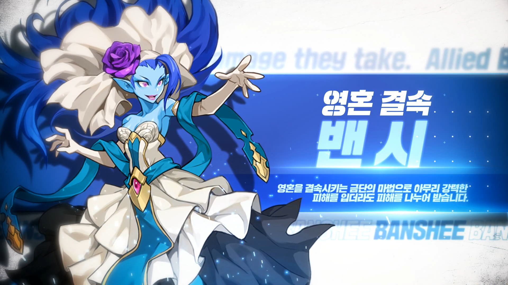 밴시들은 무서운 외형과 강력한 마법 능력 때문에 다른 종족들로부터 탄압을 받아왔습니다. 영혼을 결속시키는 금단의 마법으로 아무리 강력한 피해를 입더라도 피해를 나누어 받습니다.