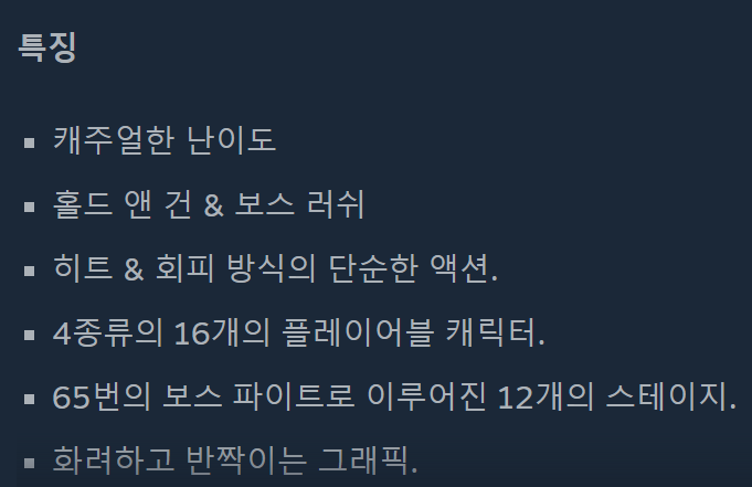 화려한 플레이와 아름다운 맵에서 자신에게 맞는 캐릭터로 난이도를 선택해 즐길수있는 건슈팅 보스러쉬 게임입니다. 스팀을 통해 2022년 1월4일 출시예정이며 한국어 지원합니다.