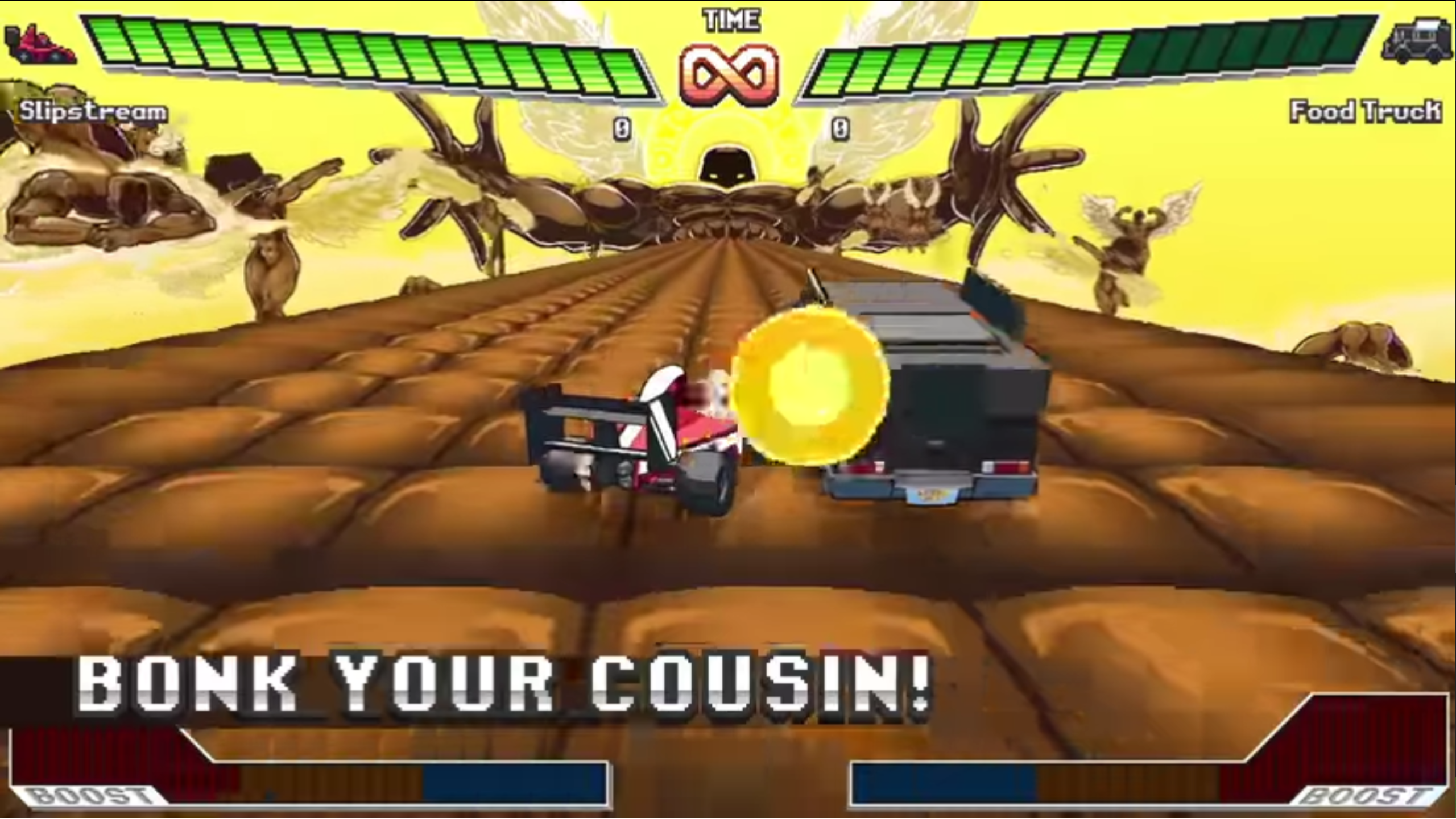 - 격투 모드에서 다른 플레이어(또는 CPU)와 1v1로 대결하세요. 자동차로. 나도 몰라, 나는 샤워 중에 그것을 생각해 냈다.