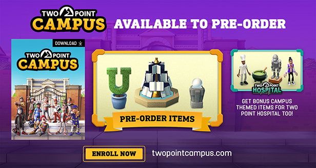 Two Point Campus를 진작부터 현명하게 고르신 분들은 자신의 웅장한 대학교 교정을 장식할 수 있는 멋진 보너스 아이템을 받게 됩니다. 깔끔한 ‘U’자형 정원을 가꾸고, 지식의 샘으로 배움을 향한 갈증을 해소하시고(음용수는 절대 아닙니다), 지혜의 진주에서 따뜻한 학문의 빛을 만끽하세요!